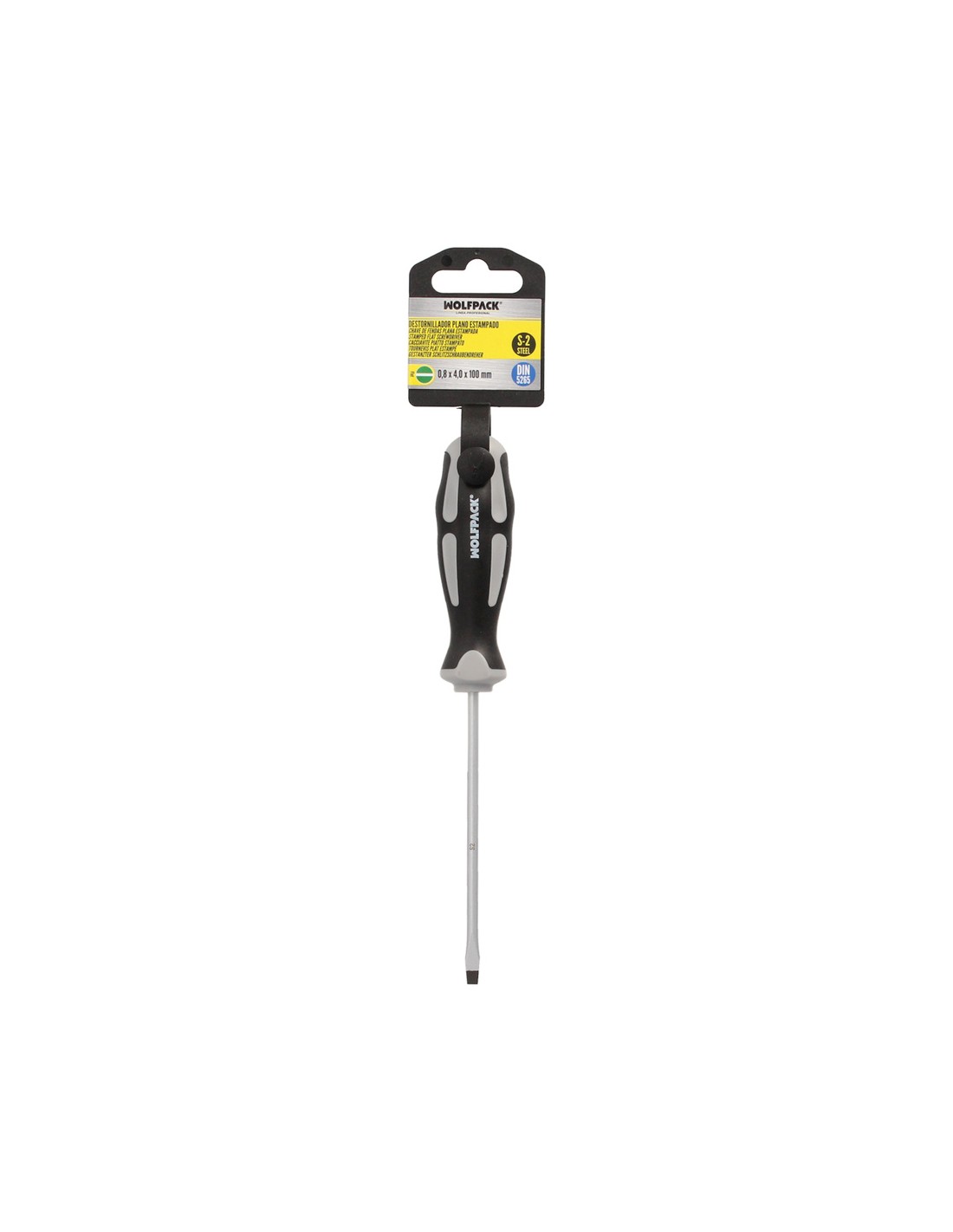 Destornillador Plano Estampado Acero S2 Mango TPR Bimaterial. Medida 0,8 x Ø 4,0 x 100 mm. DIN5265