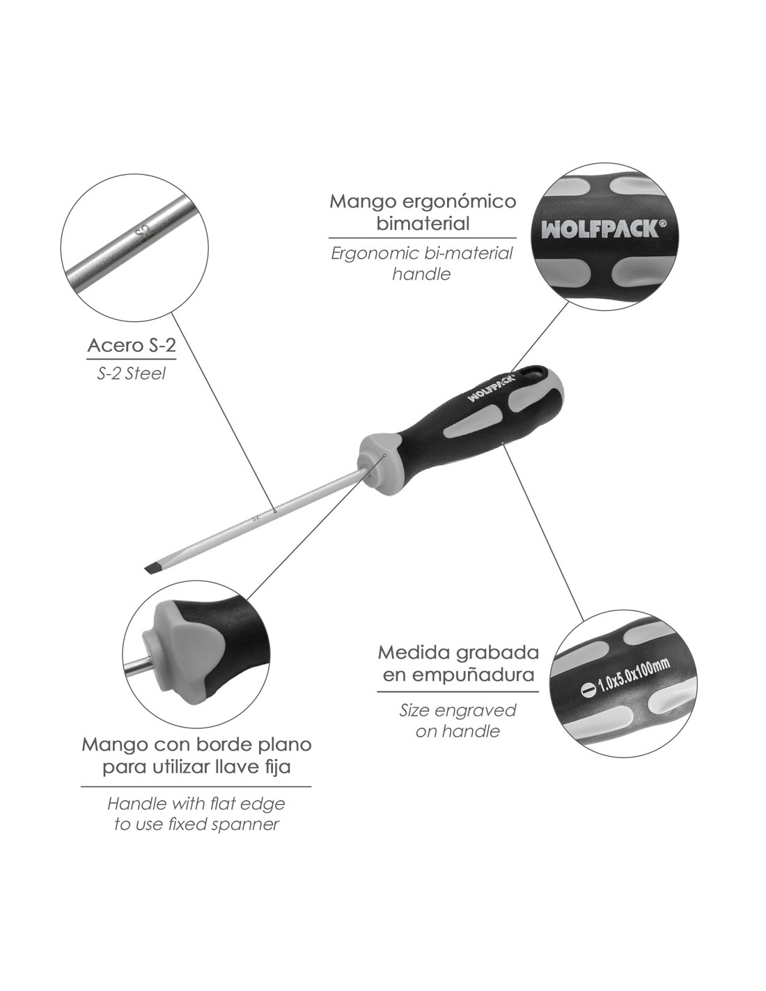 - Mango con acabado plano para poder usar una llave fija o una llave inglesa y aumentar la fuerza de apriete, también se puede como otro si fuera un mago T, introduciendo otro destornillador a través del orificio del mango.
