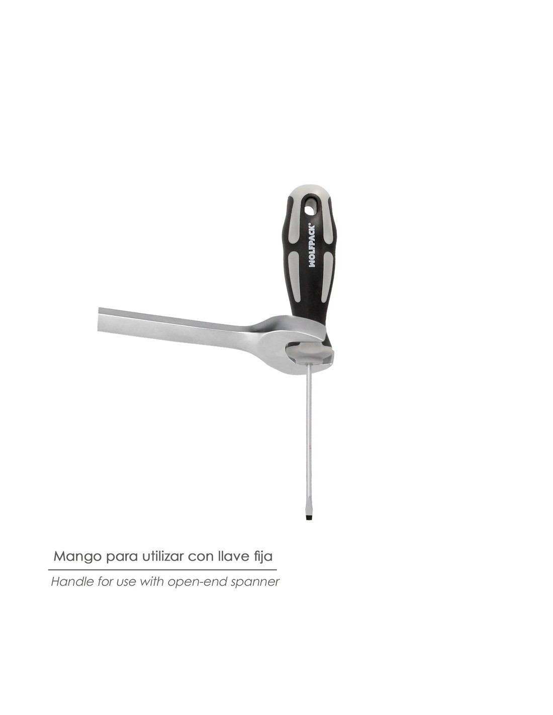 - Mango con acabado plano para poder usar una llave fija o una llave inglesa y aumentar la fuerza de apriete, también se puede como otro si fuera un mago T, introduciendo otro destornillador a través del orificio del mango.