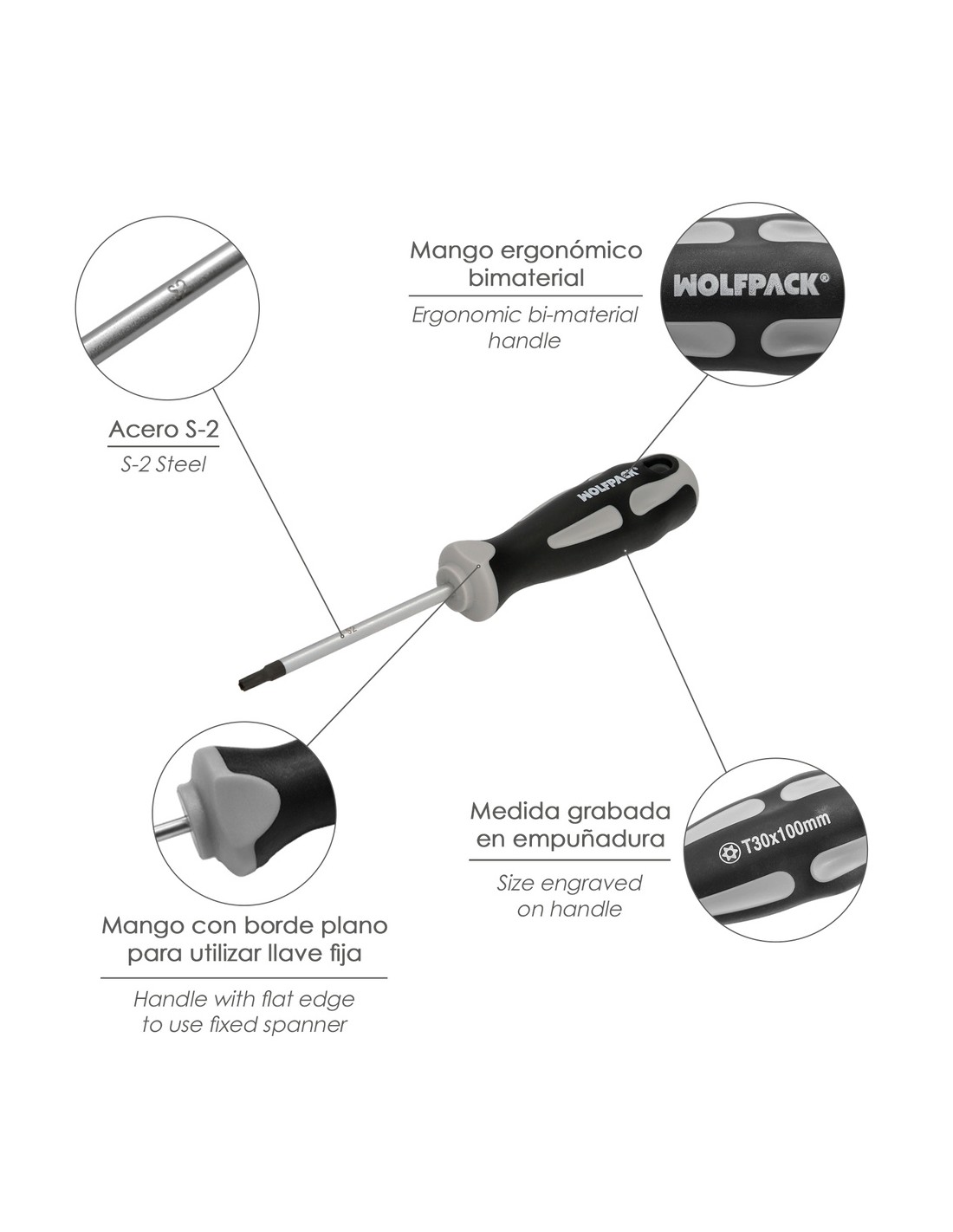 - Mango con acabado plano para poder usar una llave fija o una llave inglesa y aumentar la fuerza de apriete, también se puede usar como si fuera un mago T, introduciendo otro destornillador a través del orificio del mango.
