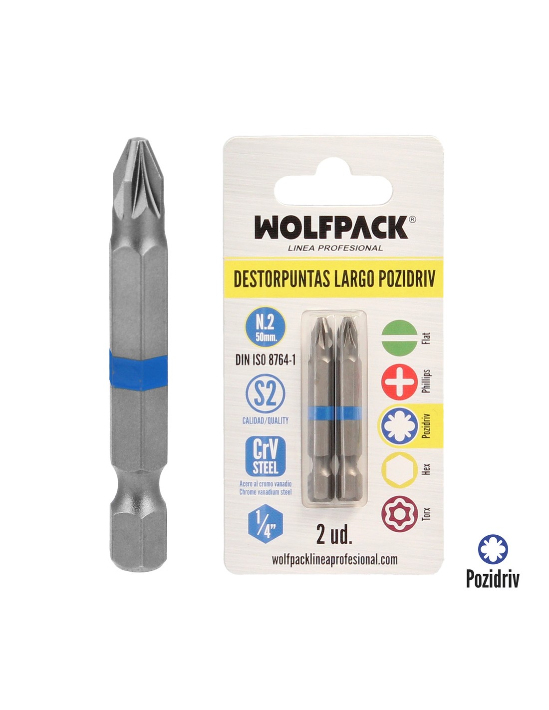 Destorpuntas Largo Pozidriv Nº 2 (2 Piezas) Acero S2 al Cromo Vanadio. Puntas Hexagonales, Destorpuntas,