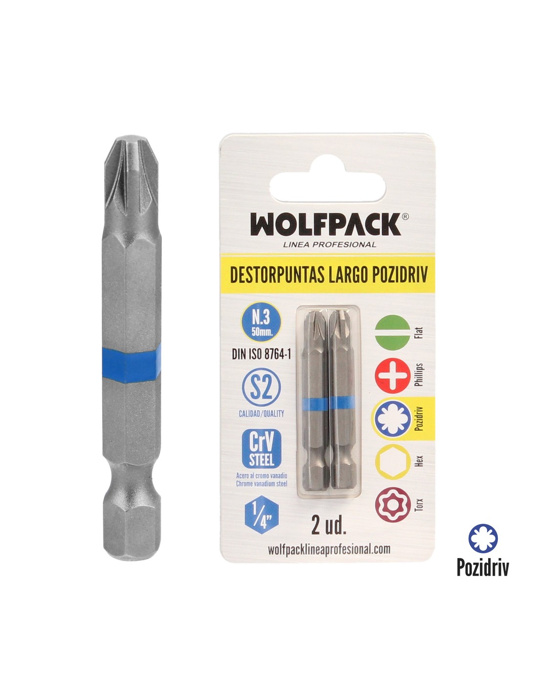 Destorpuntas Largo Pozidriv Nº 3 (2 Piezas) Acero S2 al Cromo Vanadio. Puntas Hexagonales, Destorpuntas,