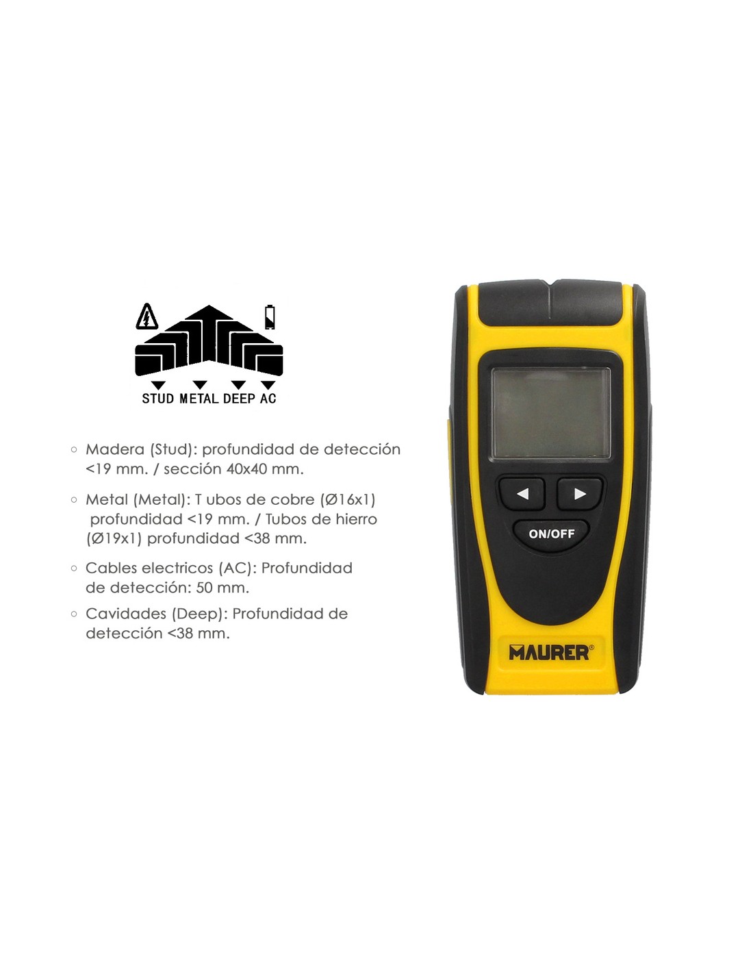 > Madera (Stud): profundidad de detección <19 mm. / sección 40x40 mm.