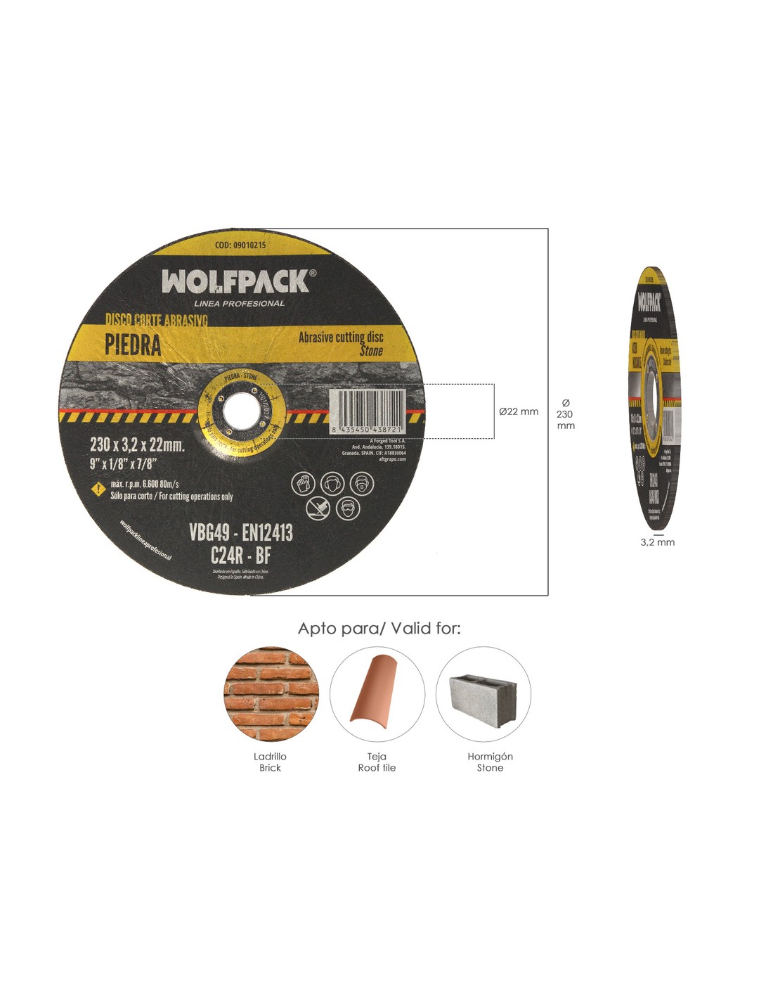 - Medidas: Diámetro exterior / anillo / grosor: Ø 230 / Ø22 / 3.2 mm