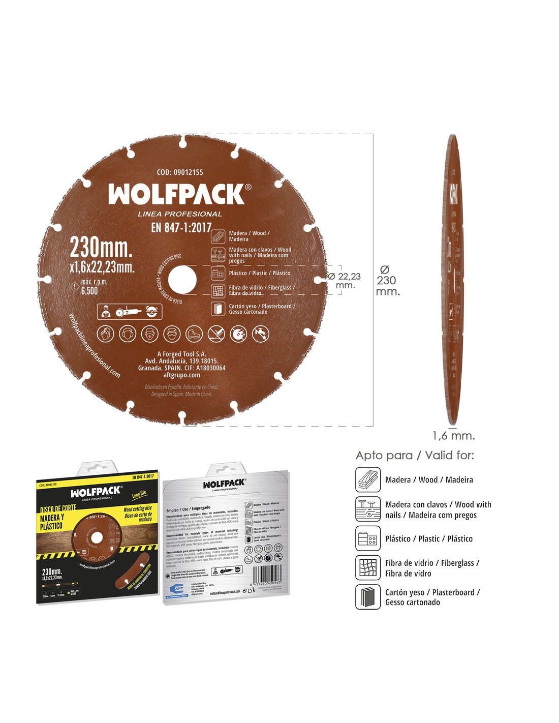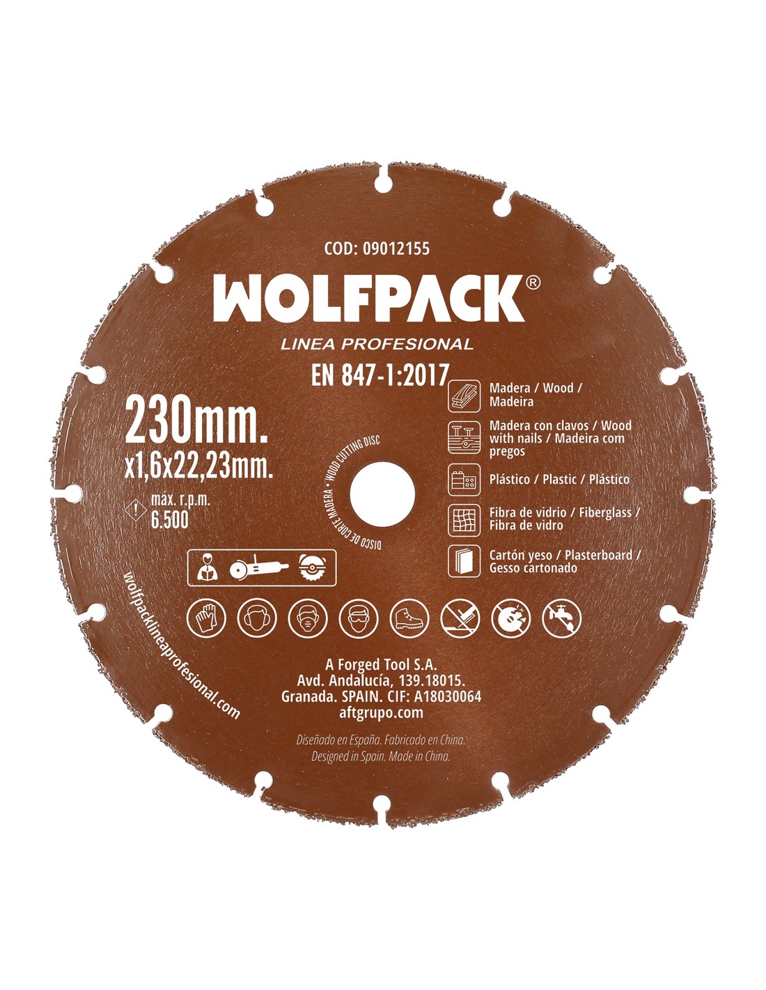 - Disco de corte con filo de carburo de tungsteno, ideal para cortar materiales como madera, plasticos, pladur, etc.