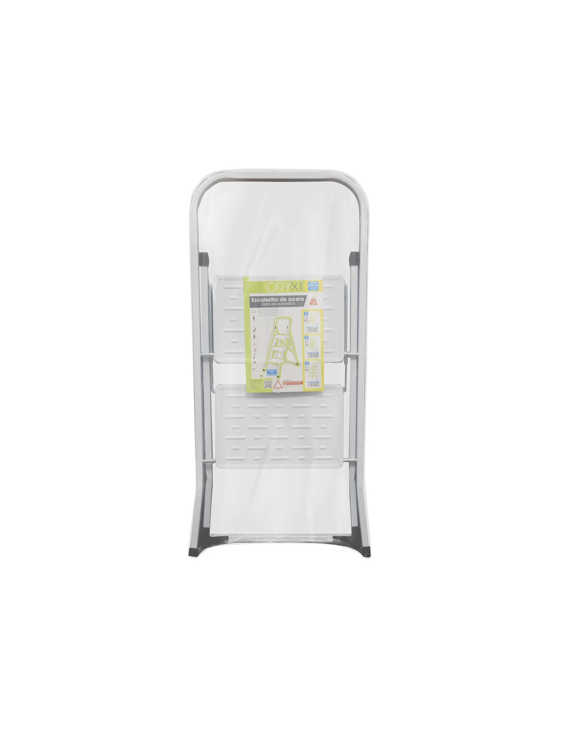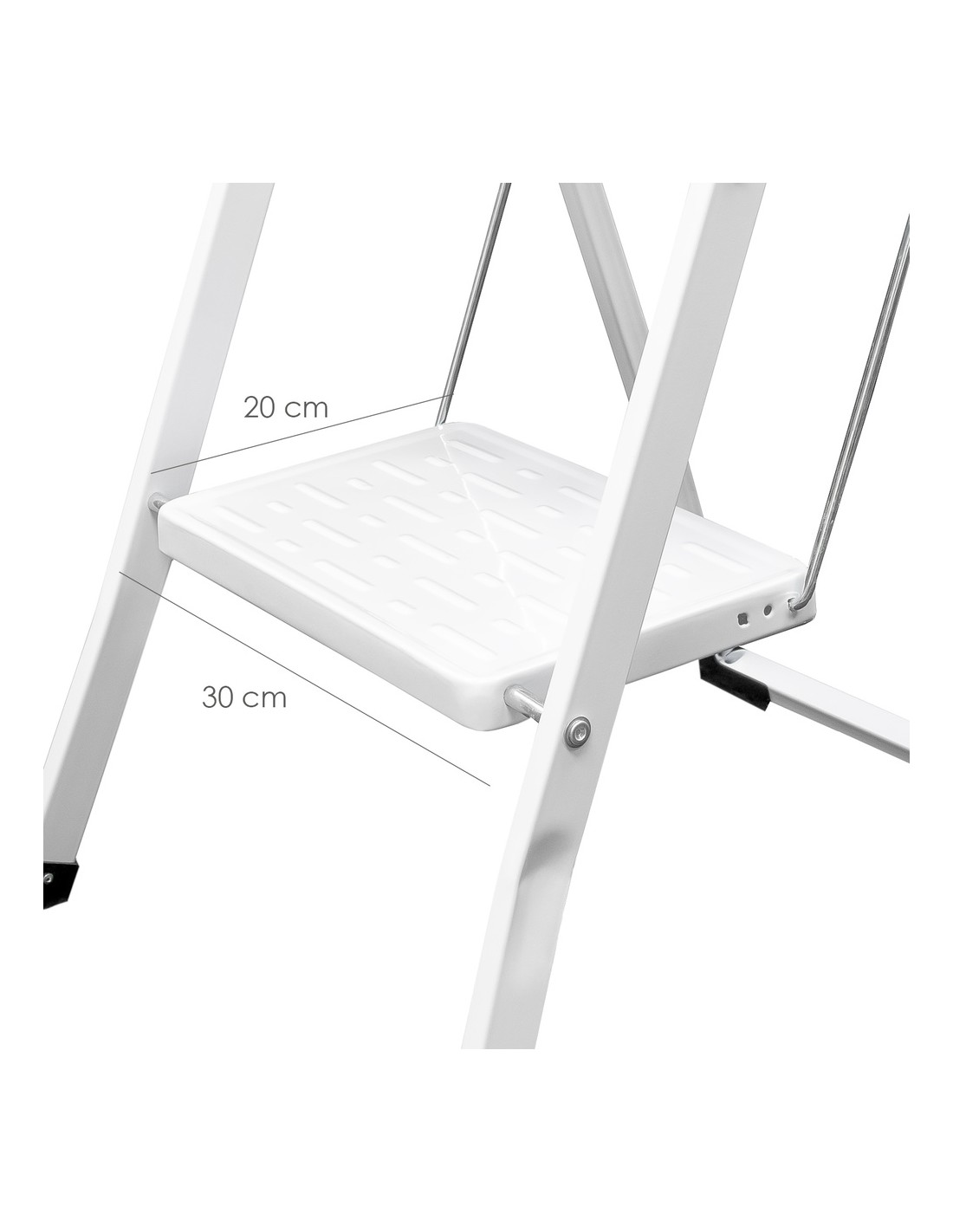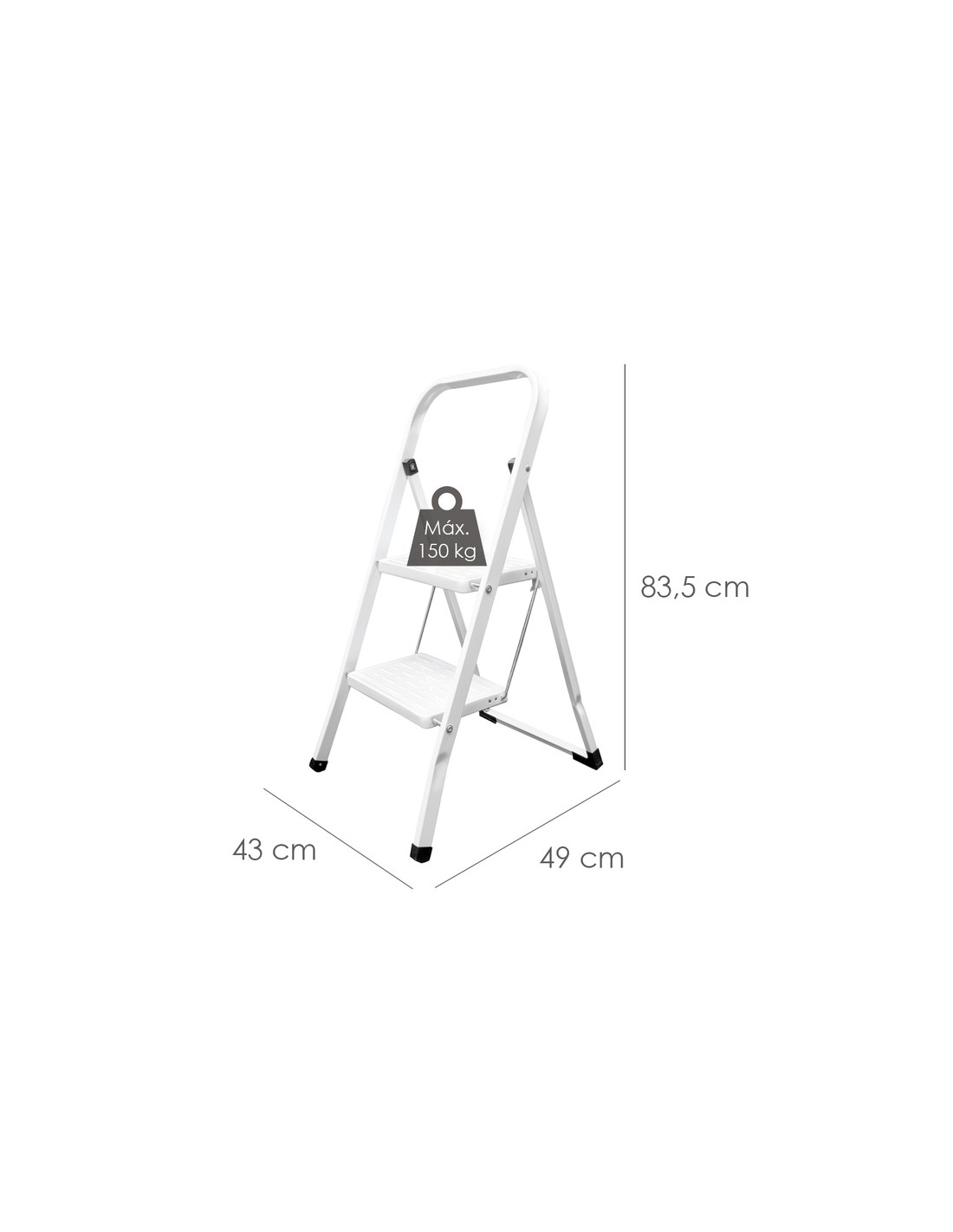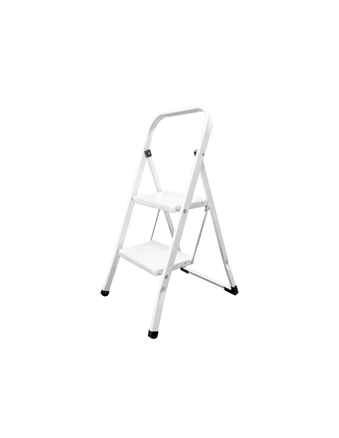 - Escalerilla fabricada en acero y color blanco, con 2 resistentes peldaños y patas de pvc antideslizantes para uso doméstico.
