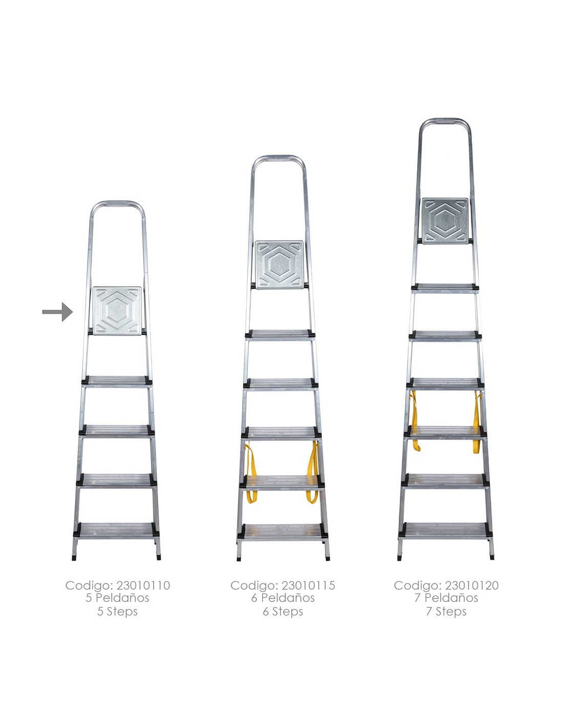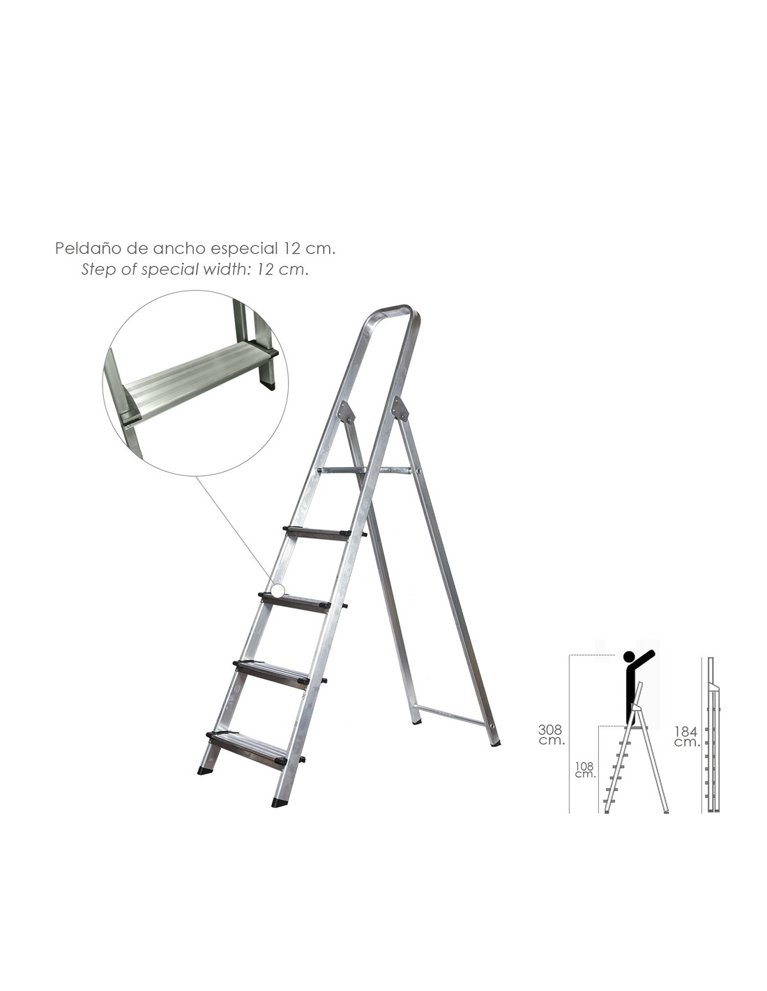 - Escalera de 5 peldaños fabricada en aluminio de alta resistencia.