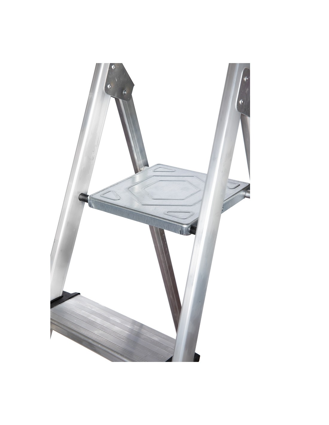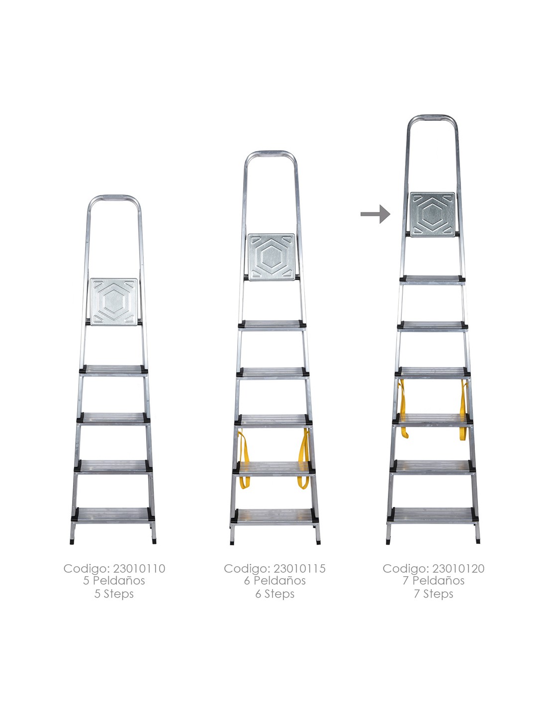 - Escalera de 7 peldaños fabricada en aluminio de alta resistencia con correas de bloqueo de seguridad.