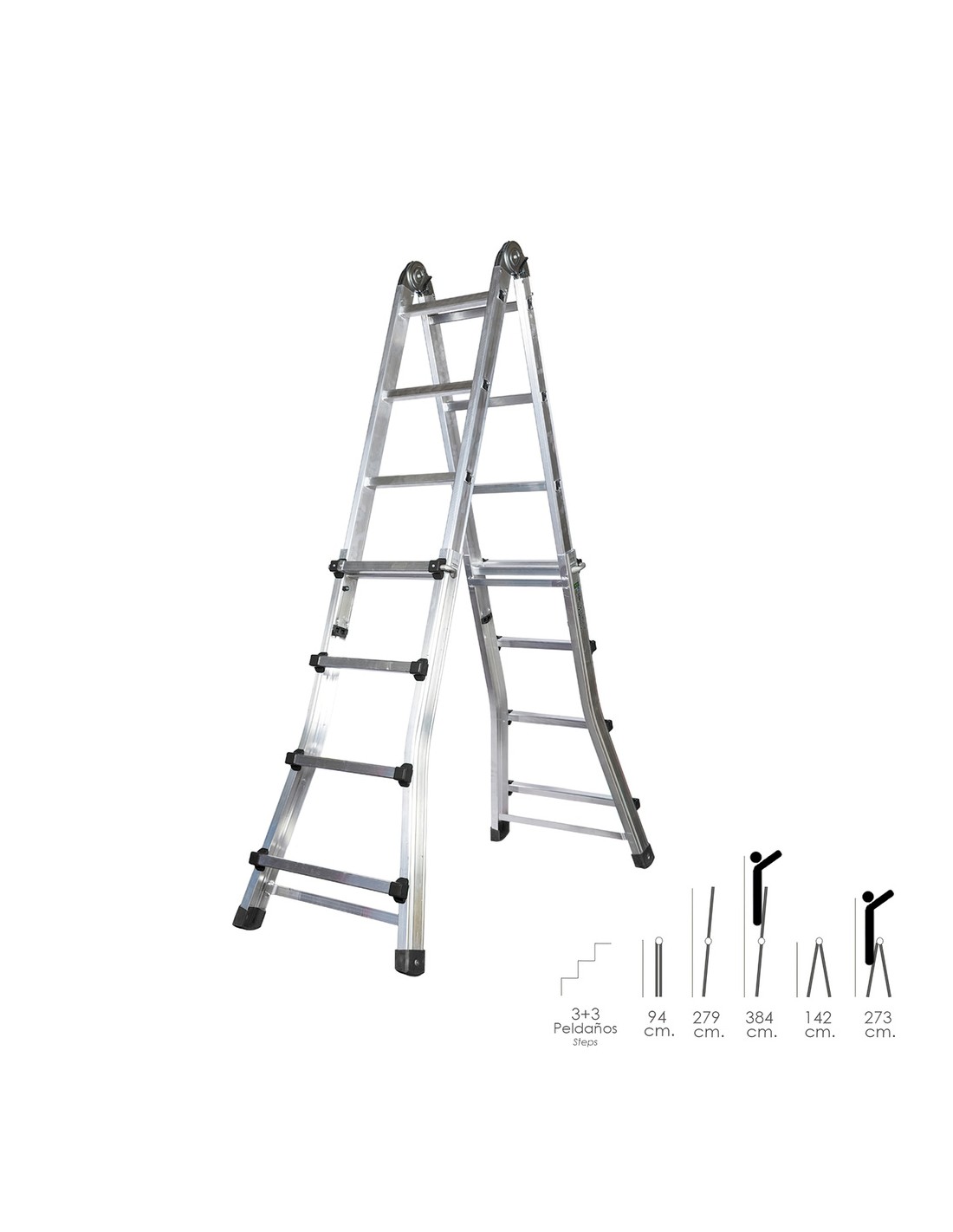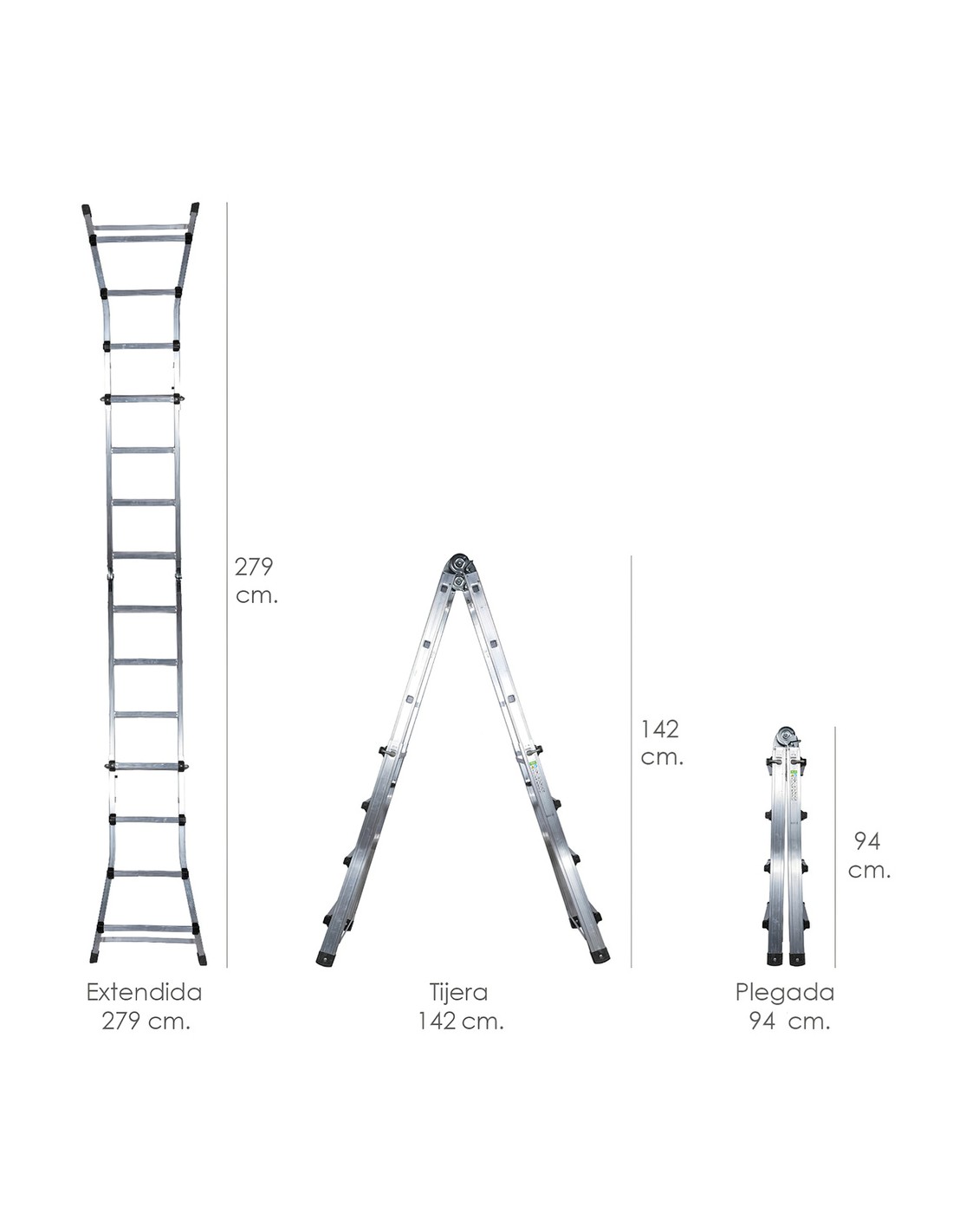- Altura plegada / tijera / extendida: 94 / 142 / 279 cm.