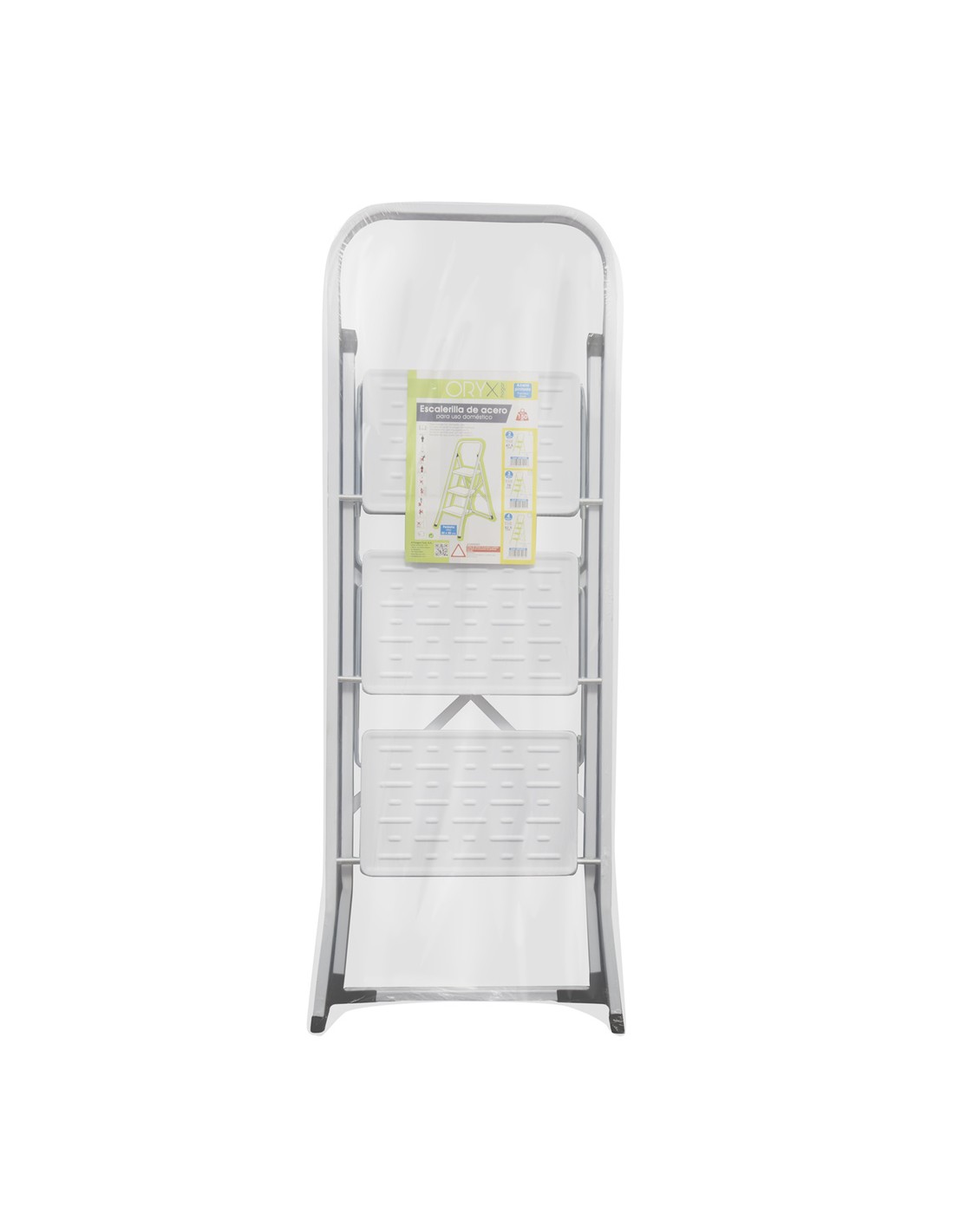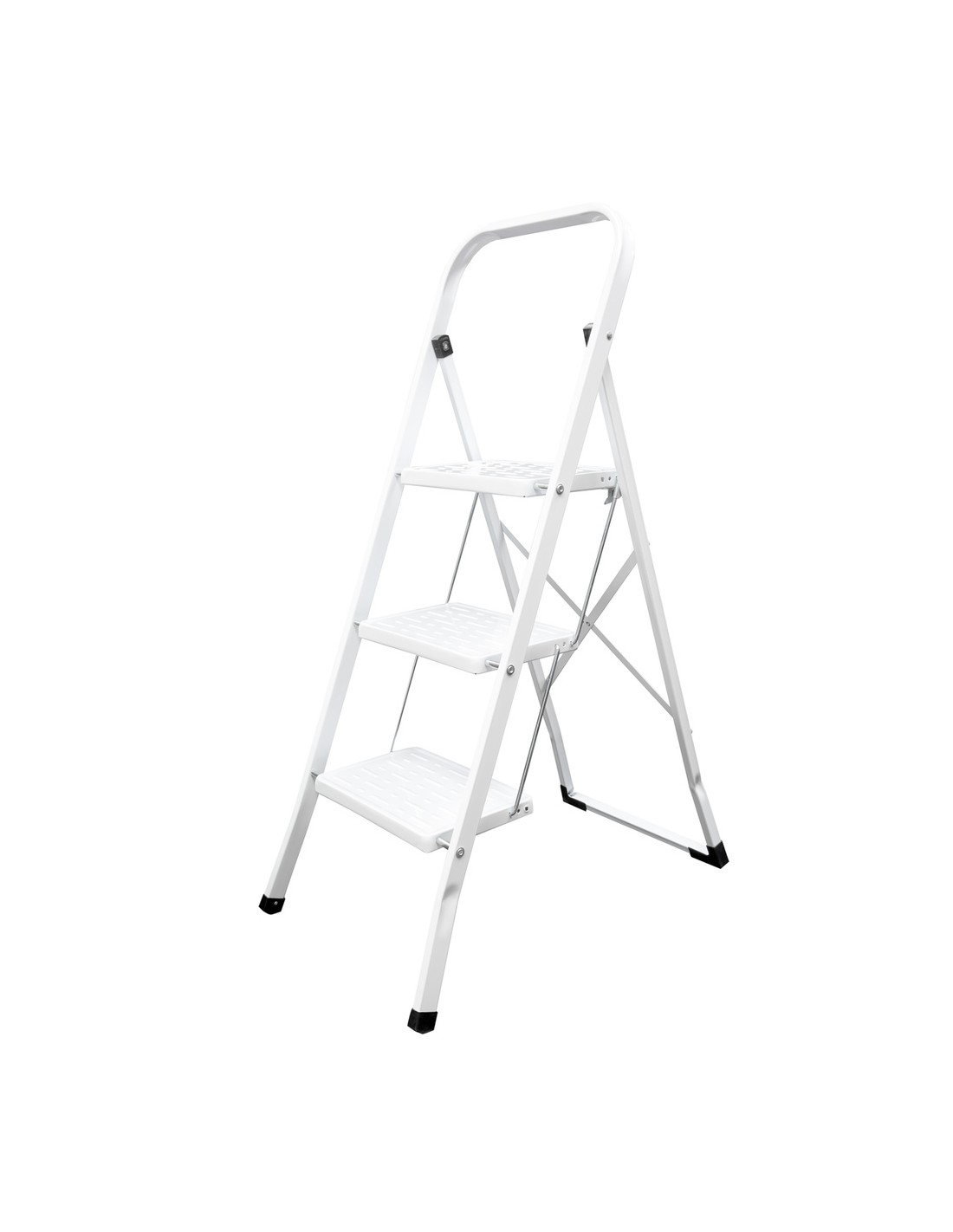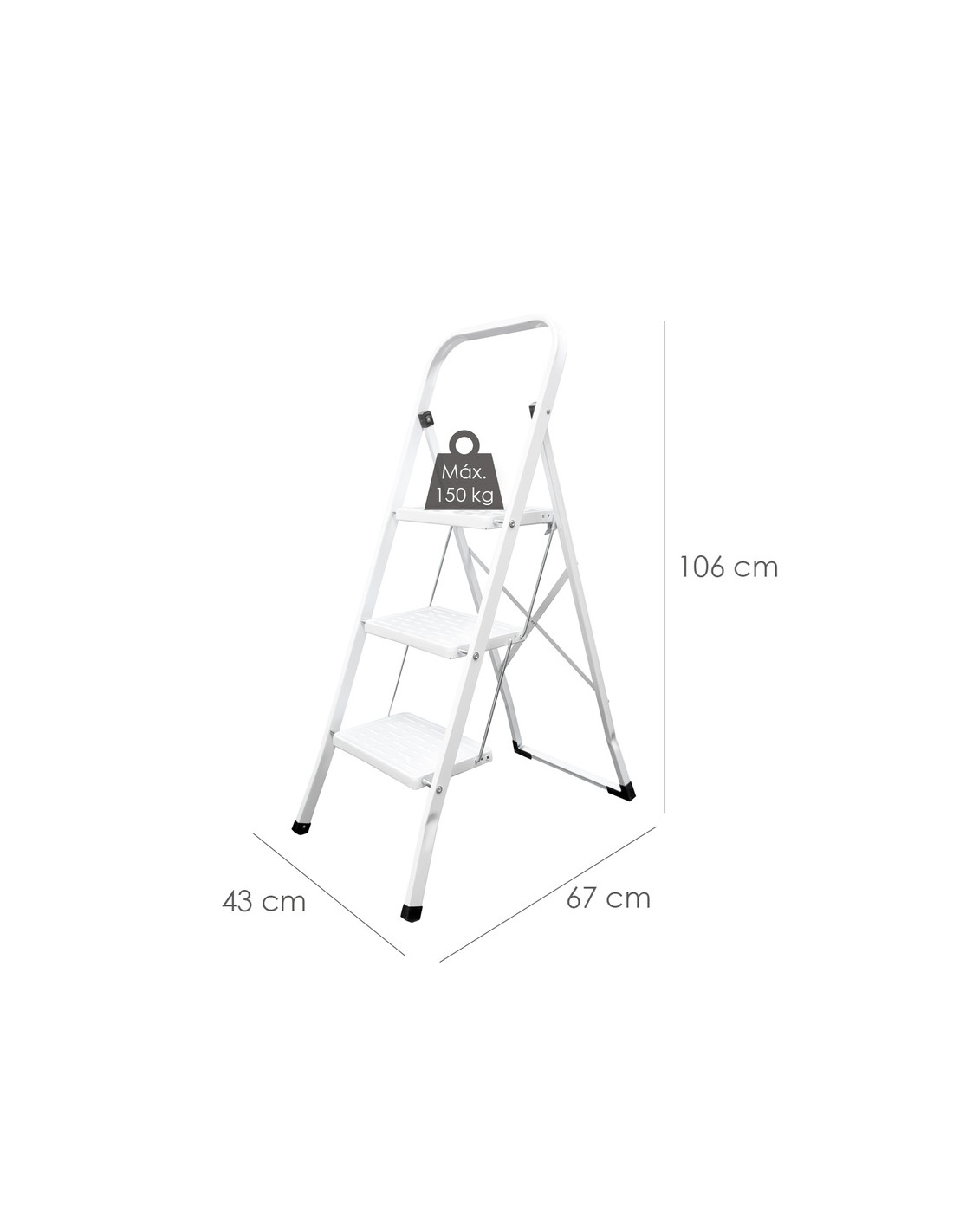 - Escalerilla fabricada en acero y color blanco, con 3 resistentes peldaños y patas de pvc antideslizantes para uso doméstico.