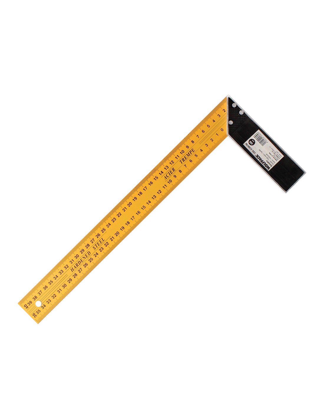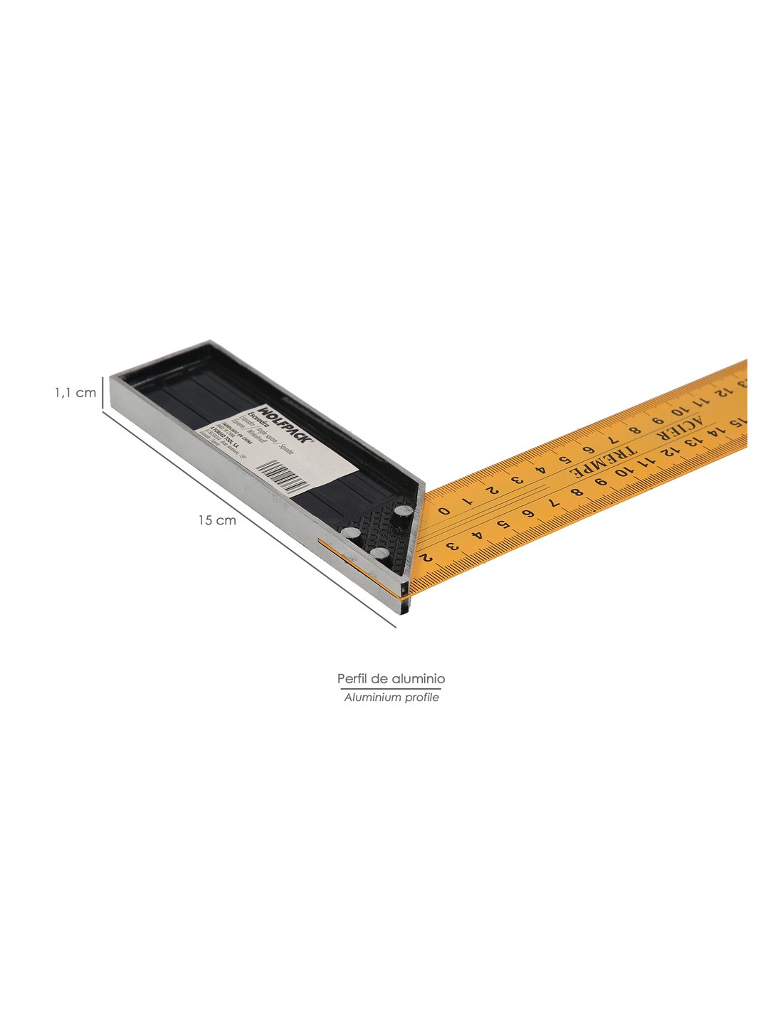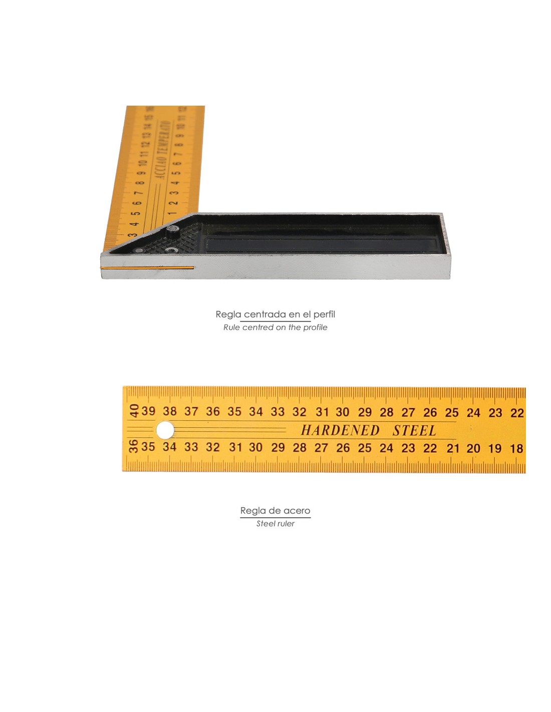 Escuadra metalica. - Medida: 400 mm. - Regla realizada en acero templado. - Mango de aluminio. - Puede señalizar angulos de 90º y 45º - Ideal para trabajos de construcción, carpinteria.