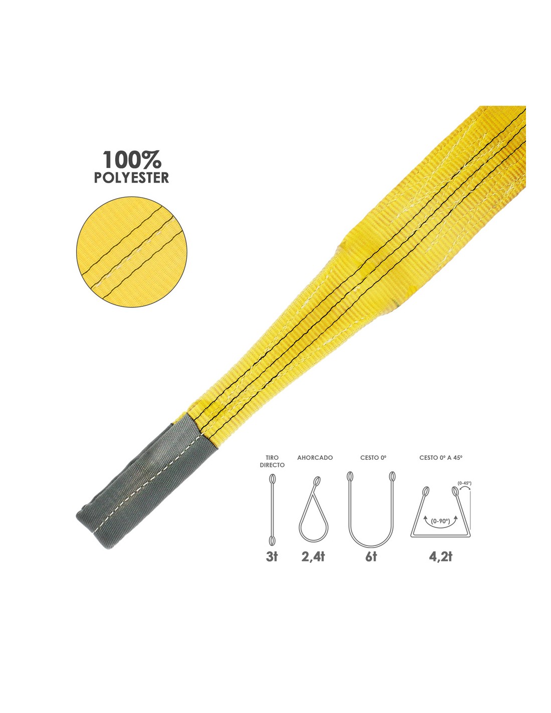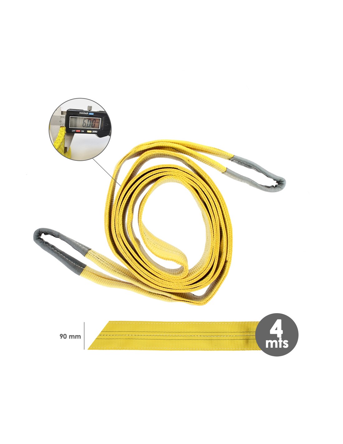 Eslinga Plana Doble Banda 3.000 Kg. Factor Seguridad 7:1, Longitud: 4 Metros Ancho 9 cm. 100% Poliester. Color Amarilla
