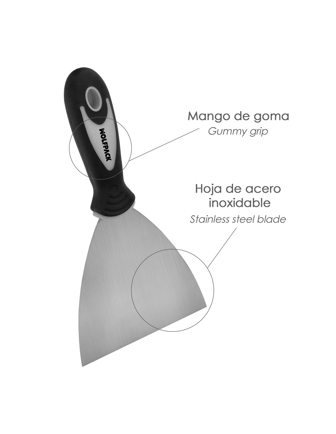- Espatula fabricada en acero inoxidable de 80 mm. y mango ergonomico de goma.