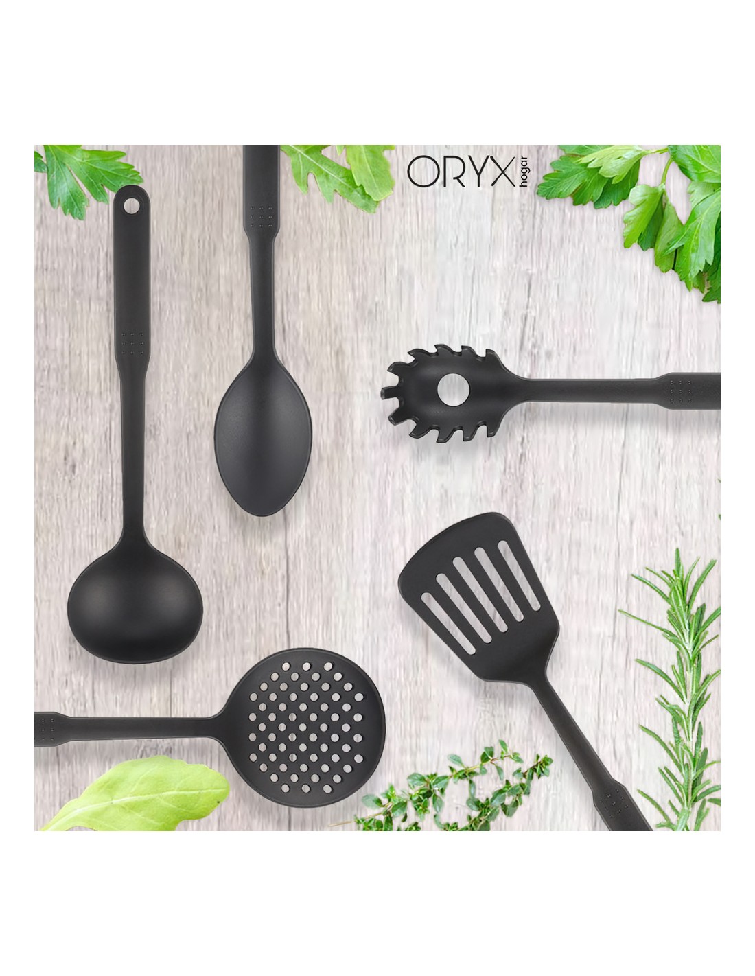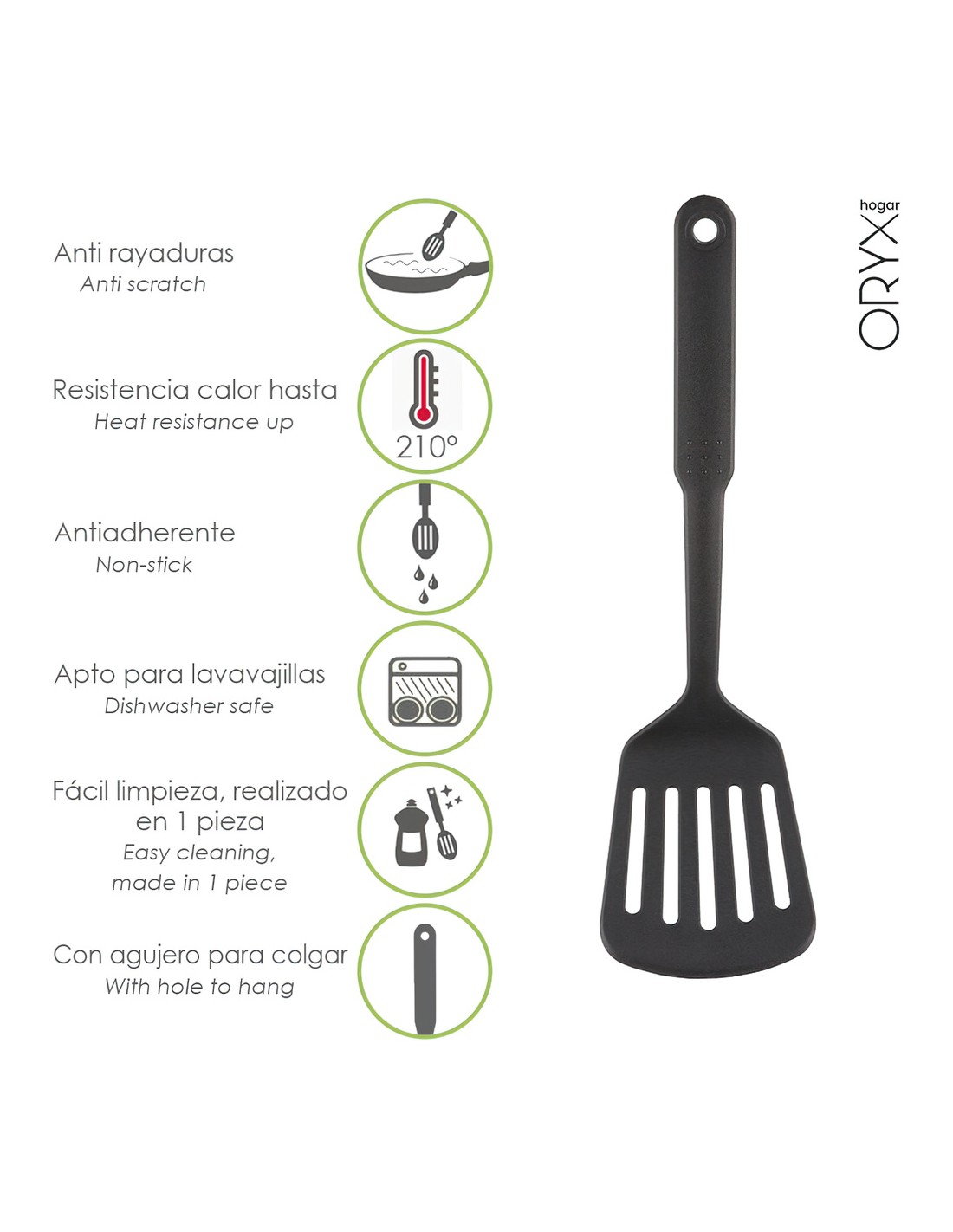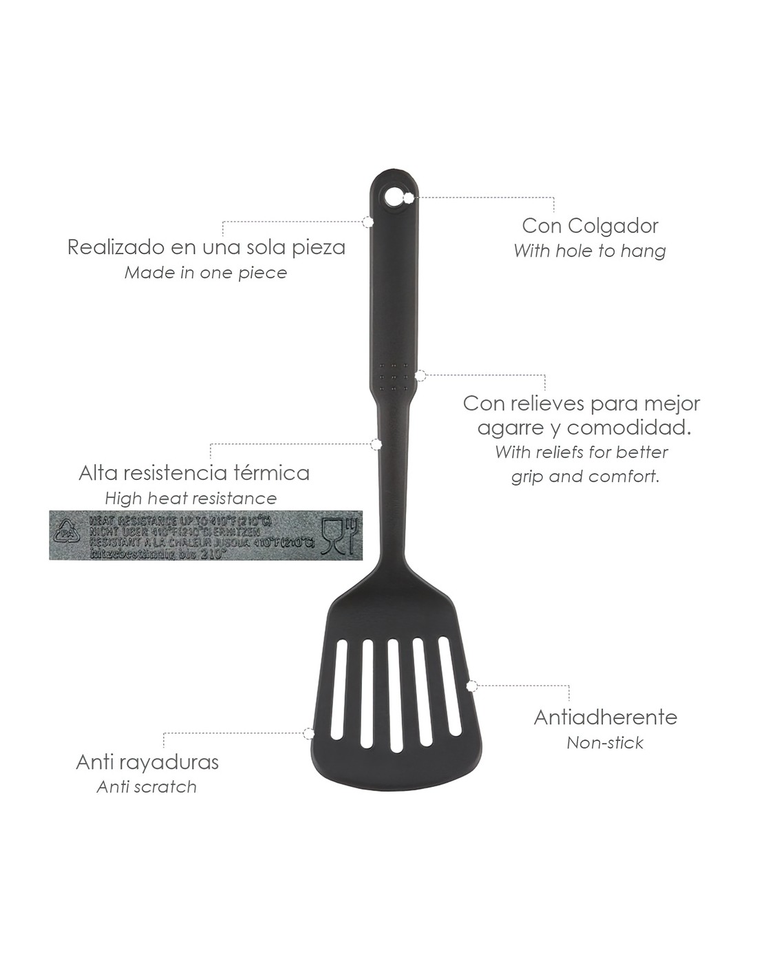 - Realizado en nylon, material ligero y resistente. Material similar a la silicona, ya que ambos materiales no absorven olores ni sabores ademas pueden usarse en todo tipo de sartenes y ollas, ya uqe no rayan la base.