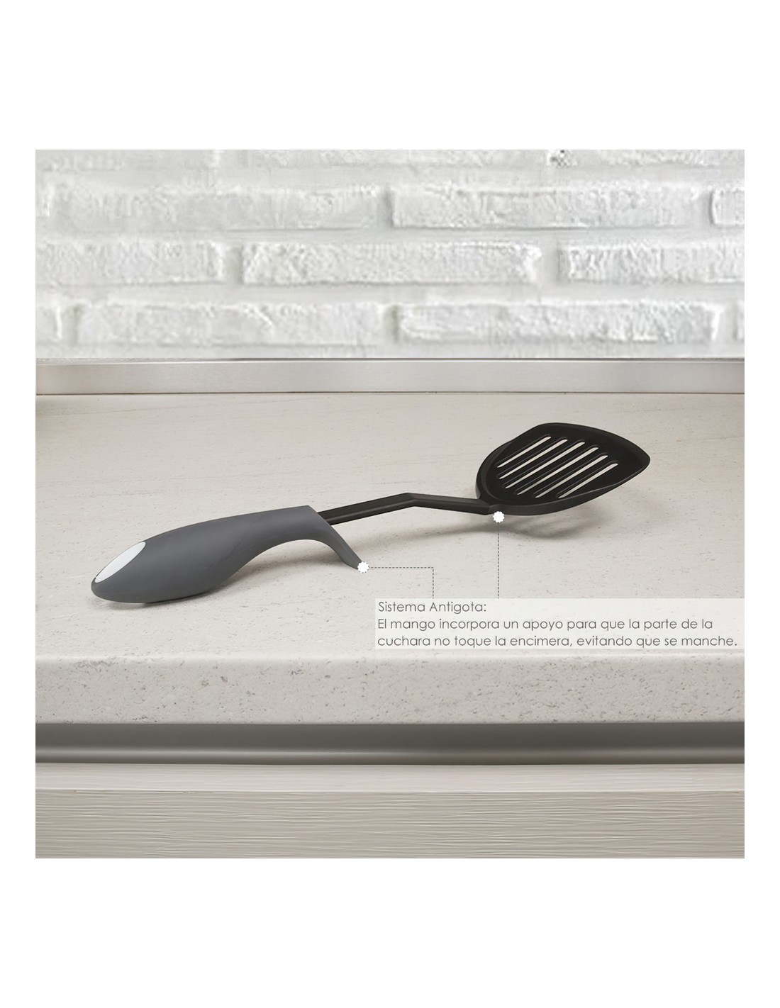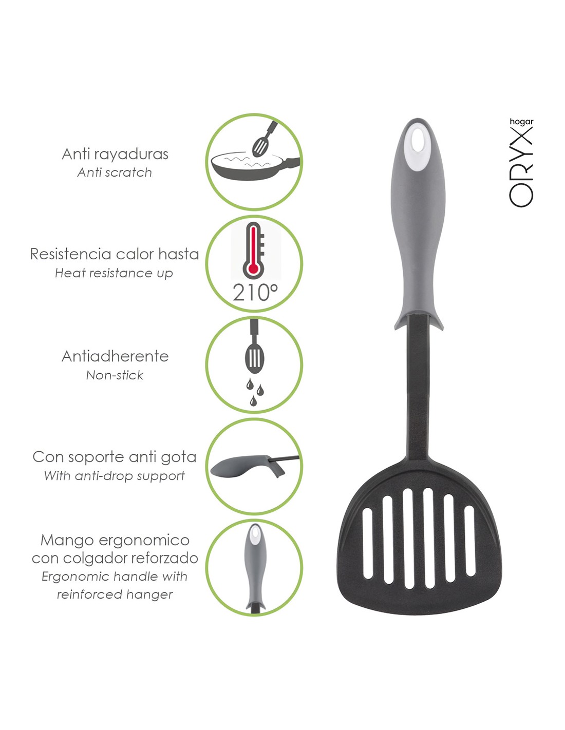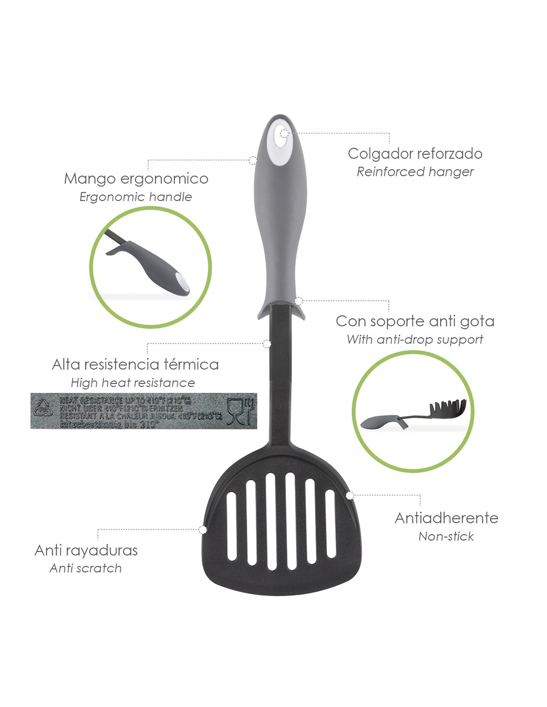 - Realizado en nylon, material ligero y resistente. Material similar a la silicona, ya que ambos materiales no absorven olores ni sabores ademas pueden usarse en todo tipo de sartenes y ollas, ya uqe no rayan la base.