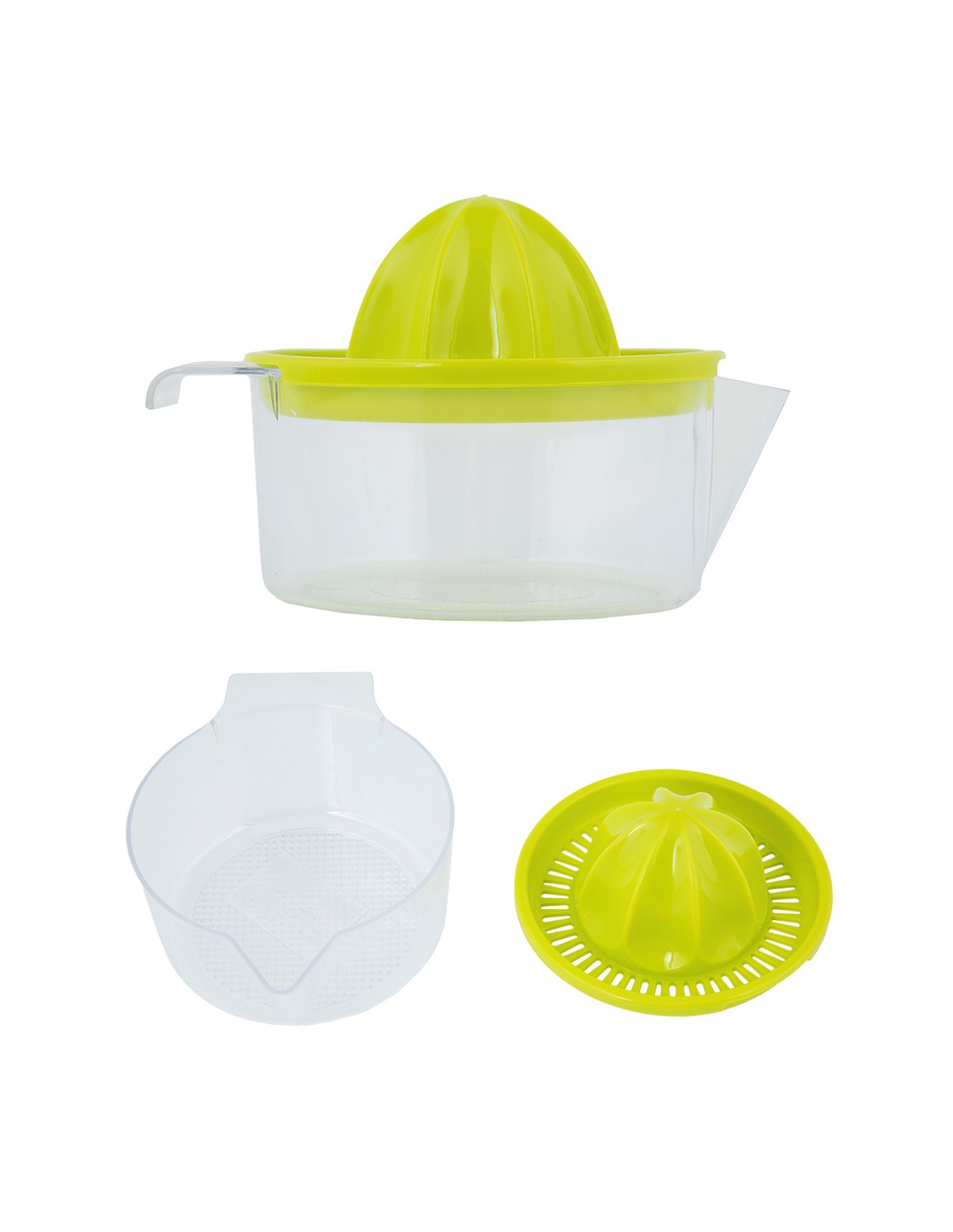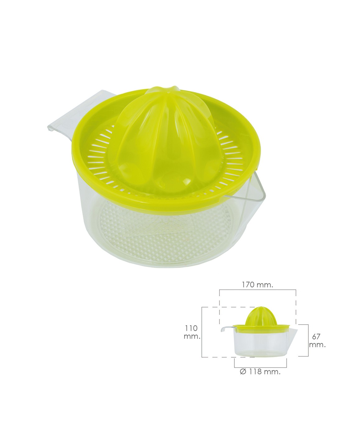 Exprimidor manual zumo - Medida: Ø 12 x 11 cm. - Con jarra de plastico en la que el exprimidor encaja a la perfección. - Realizado en plastico. - Ideal para exprimir zumos de naranjas, limones, pomelos, fruta, limas, etc.