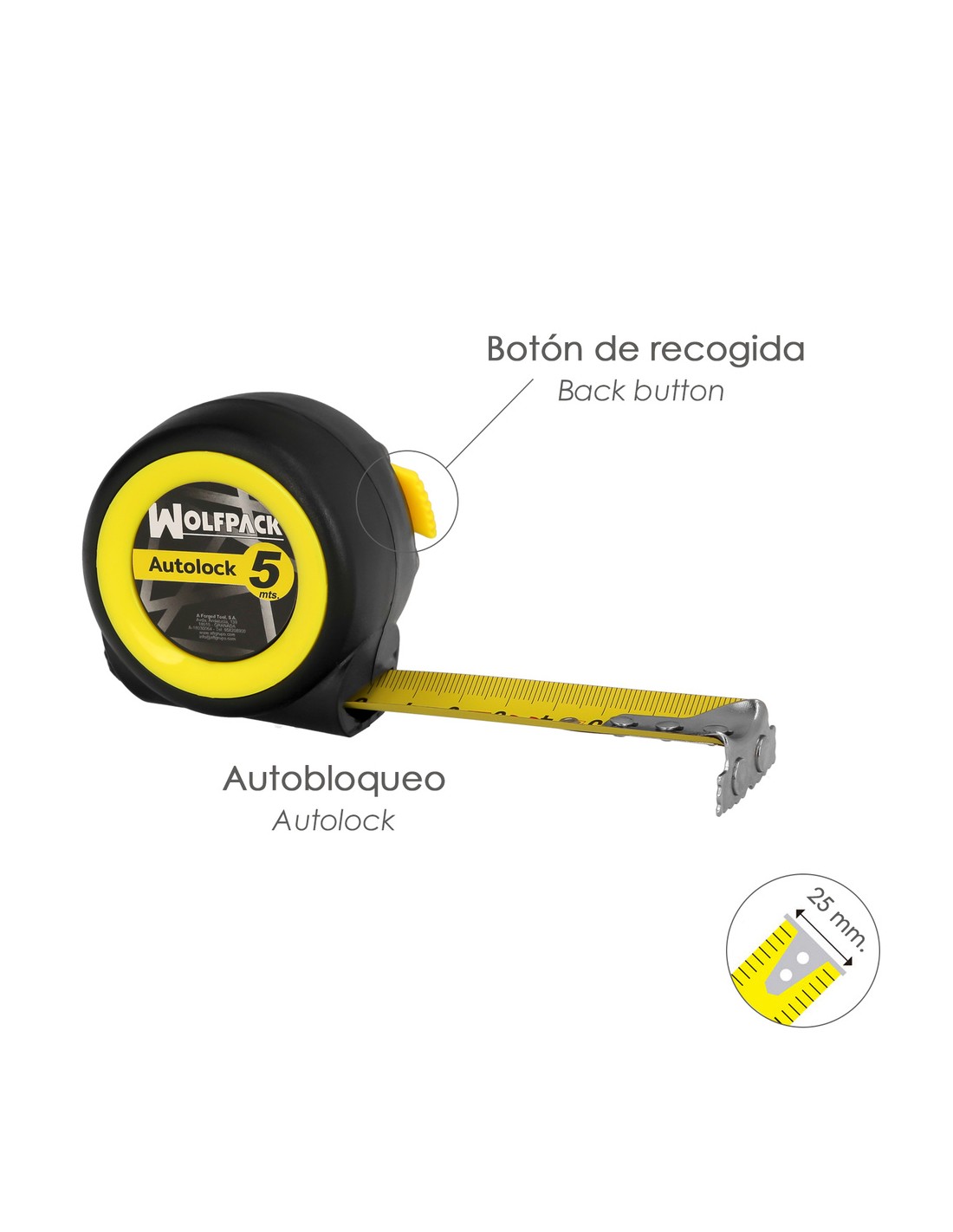 - Con sistema Autolock, se bloquea de forma automatica, conforme se va sacando la cinta, para recoger la cinta tan solo tiene que pulsar el boton de desbloqueo.