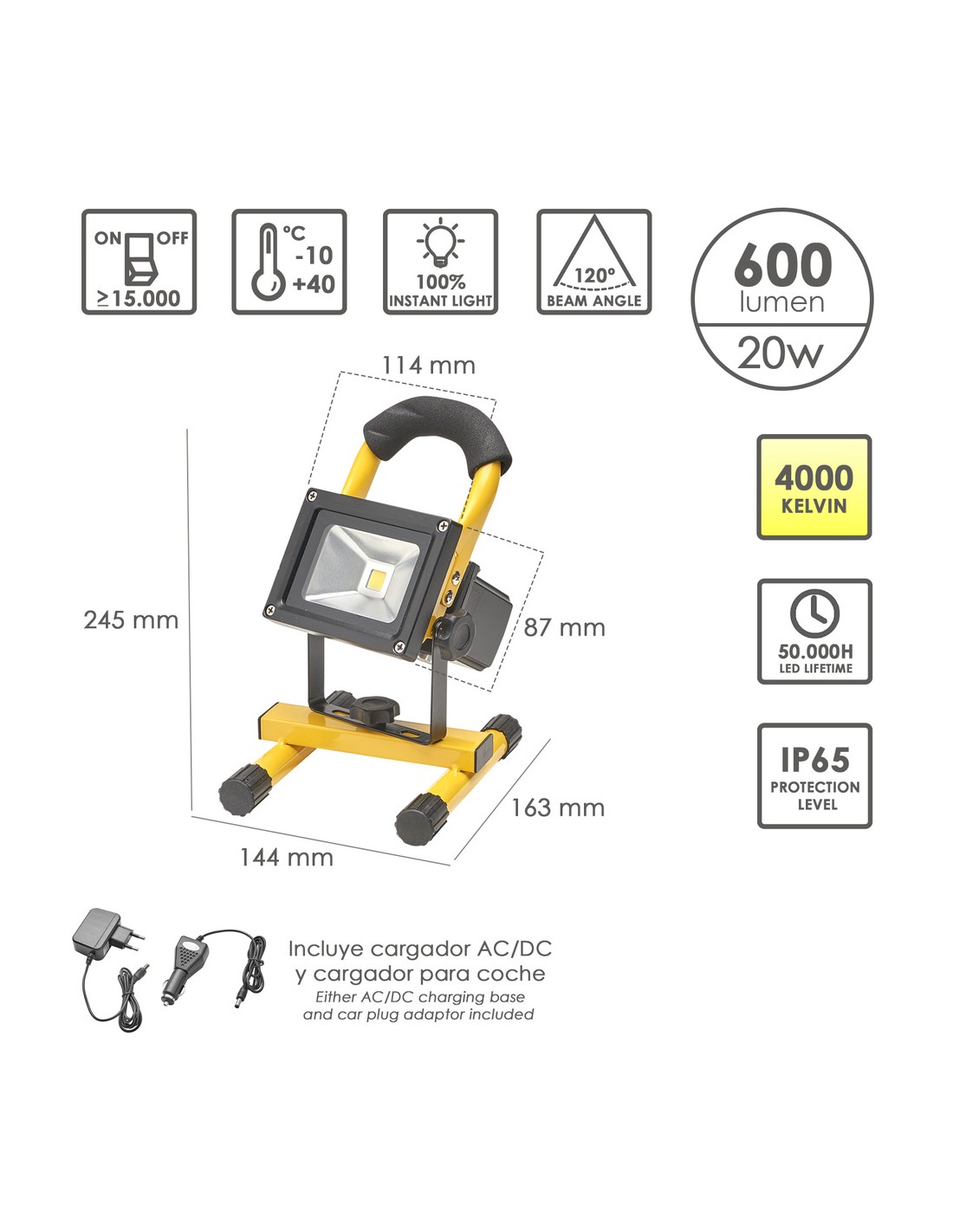 Foco Led 20 Watt. Luz Blanca 4000º K IP 65 600 Lumenes Con Asa de Transporte, Proyector Led Con Asa, Foco Led Trabajo