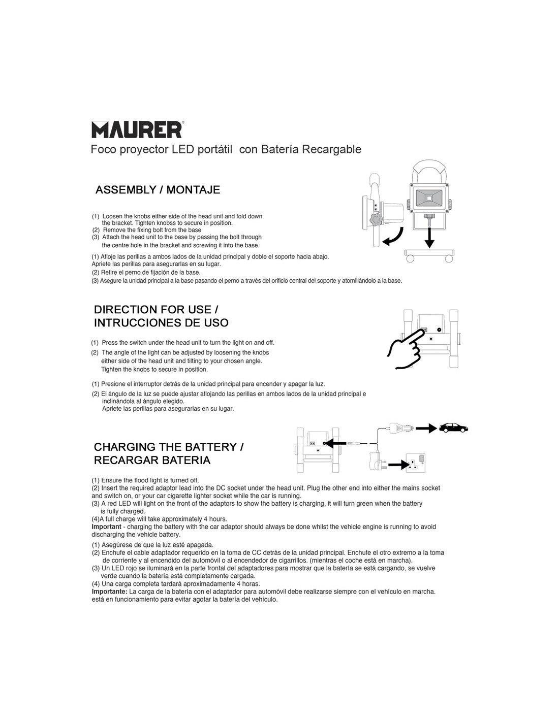 - Foco con bateria incorporada de 4 horas de duración. (Tiempo de carga 4 horas)