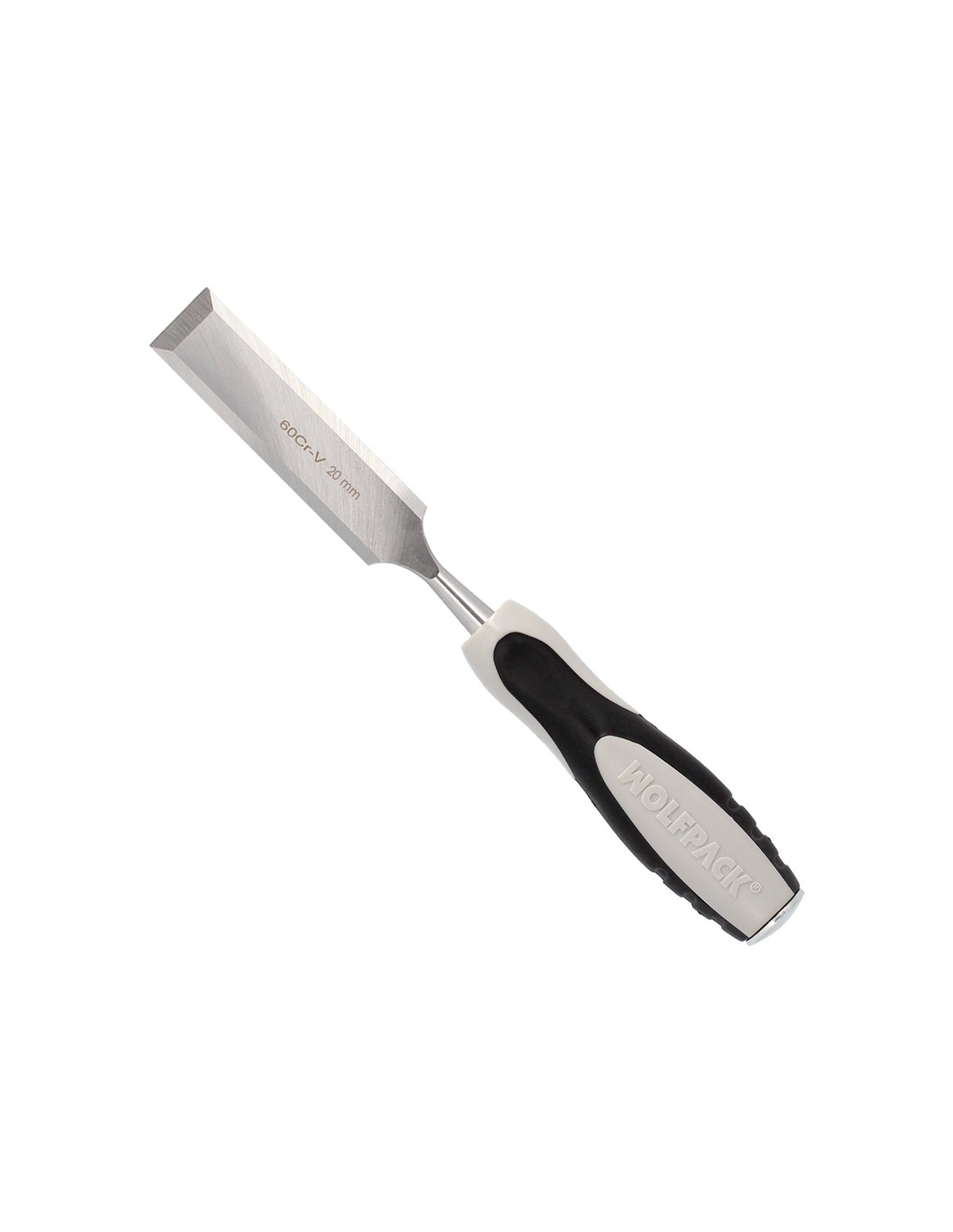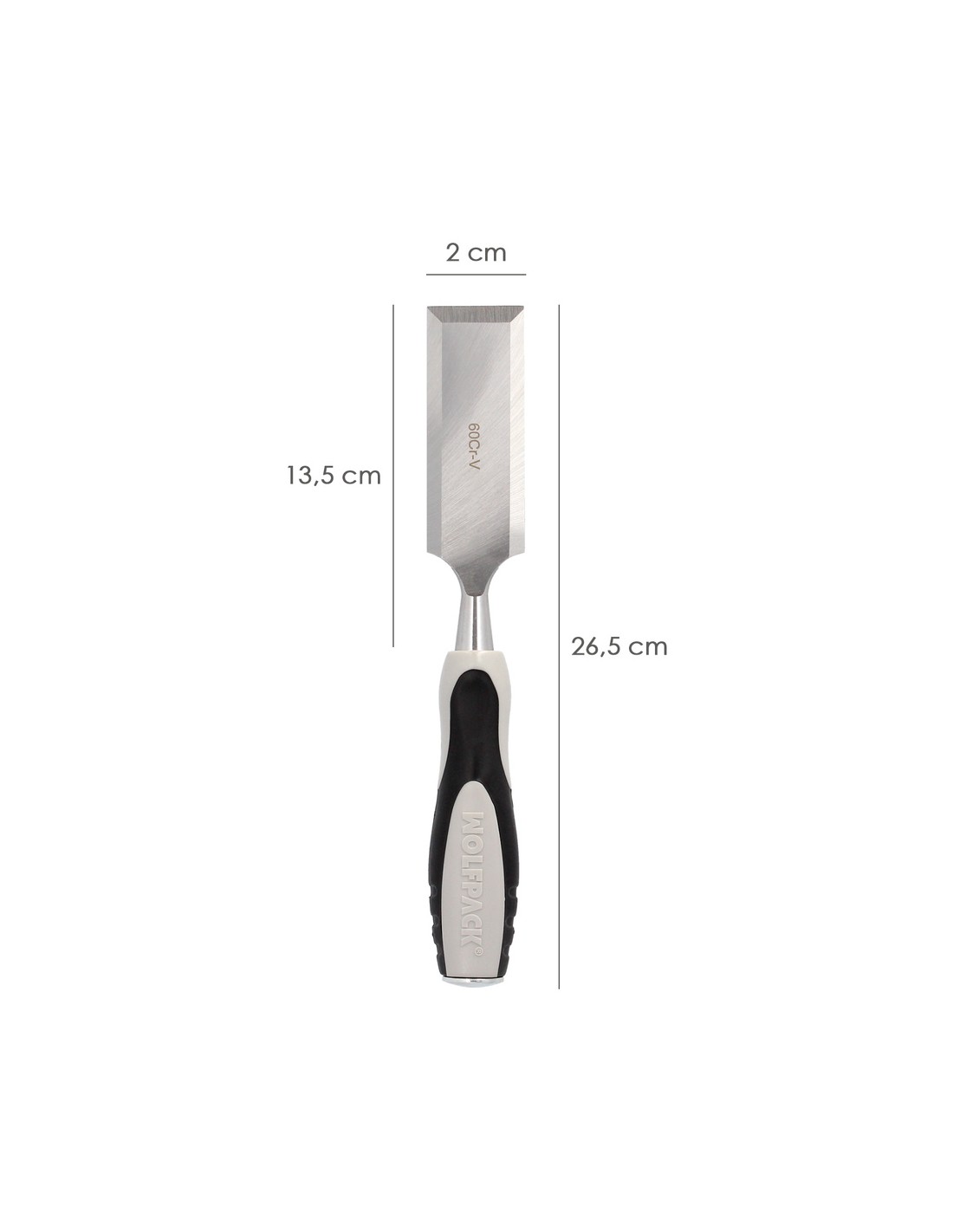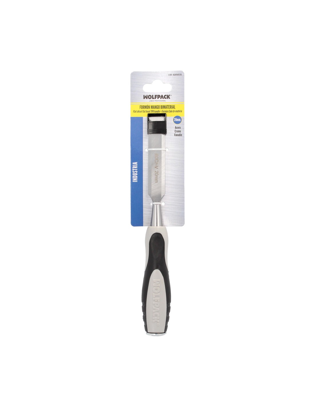 Formon Wolfpack Mango bimaterial 20 mm. - Medidas: largo x ancho, 265 x 20 mm. - Mango ergonómico bimaterial. - Fusión térmica entre mango y hoja para mayor resistencia. - Hoja de acero al cromo vanadio (especial para maderas muy duras).