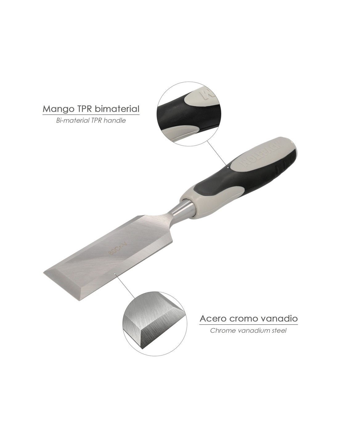 Formon Wolfpack Mango bimaterial 30 mm. - Medidas: largo x ancho, 265 x 30 mm. - Mango ergonómico bimaterial. - Fusión térmica entre mango y hoja para mayor resistencia. - Hoja de acero al cromo vanadio (especial para maderas muy duras).
