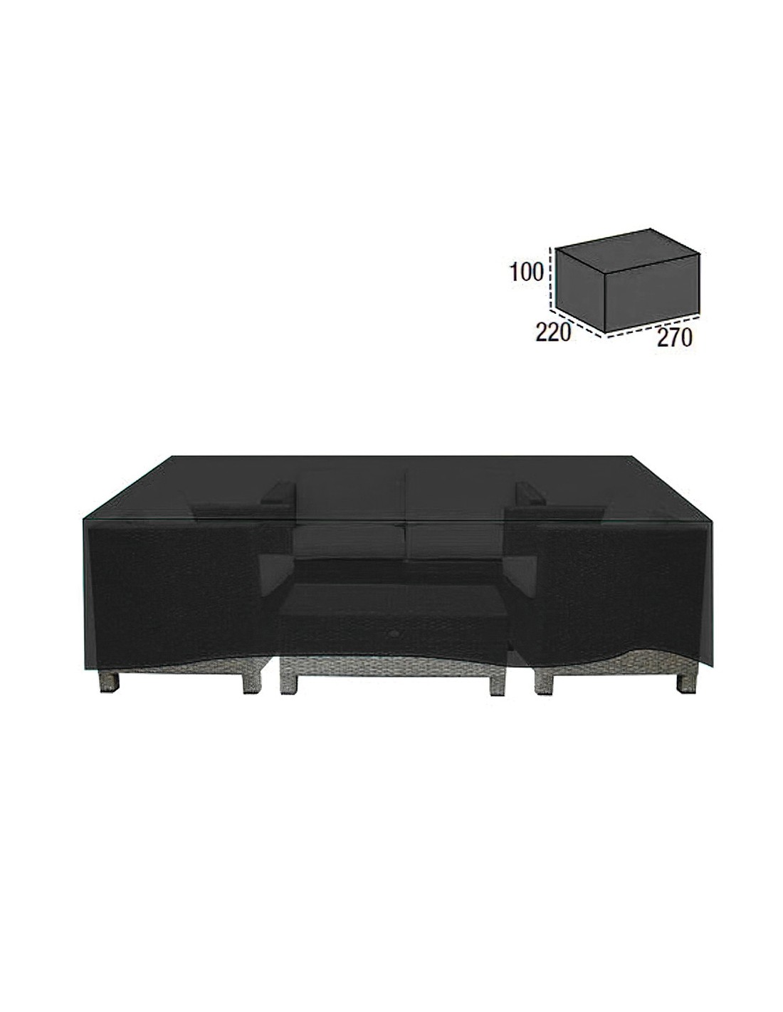 Funda cubre mesa/conjunto. - Medidas: 100x220x270. - Funda realizada en poloetileno 100 gr/m². - Con ojales de aluminio y cuerda de nylon para su fijación. - Ideal para proteger el mobiliario. - Color verde. - Articulo conocido como: funda protectora, cobertor.