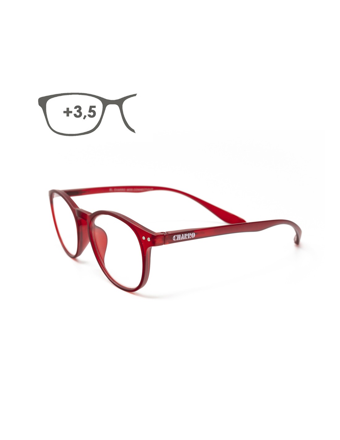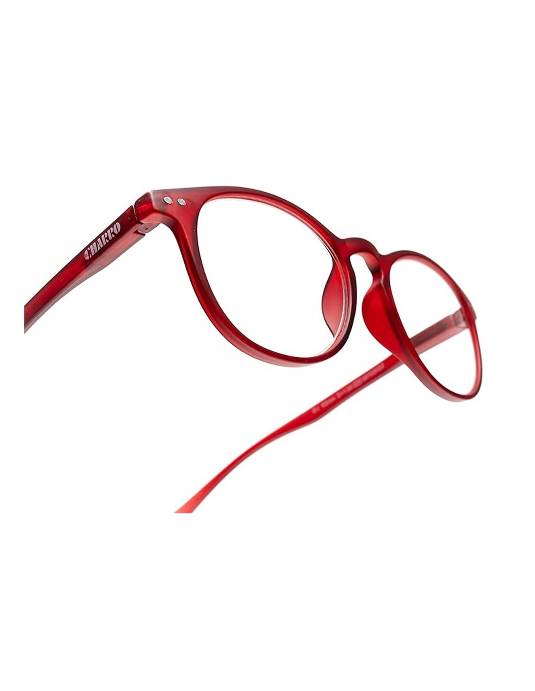 - Gafas de aumento para lectura con montura color rojo con patillas largas.