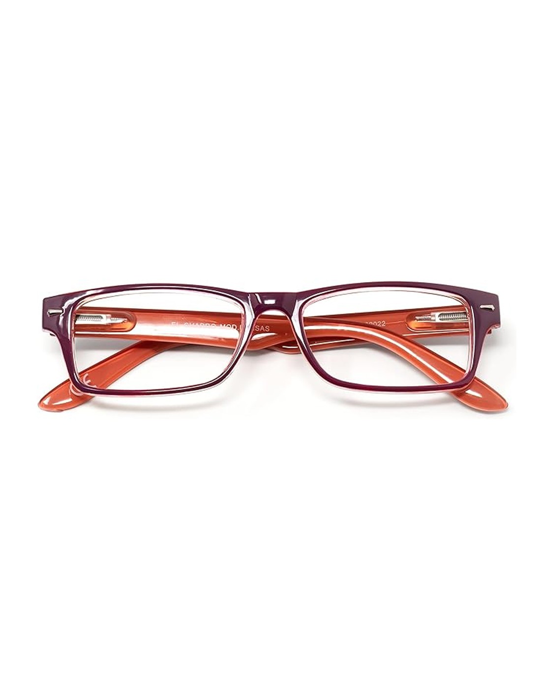 - Gafas de aumento para lectura con montura bicolor morado y naranja.