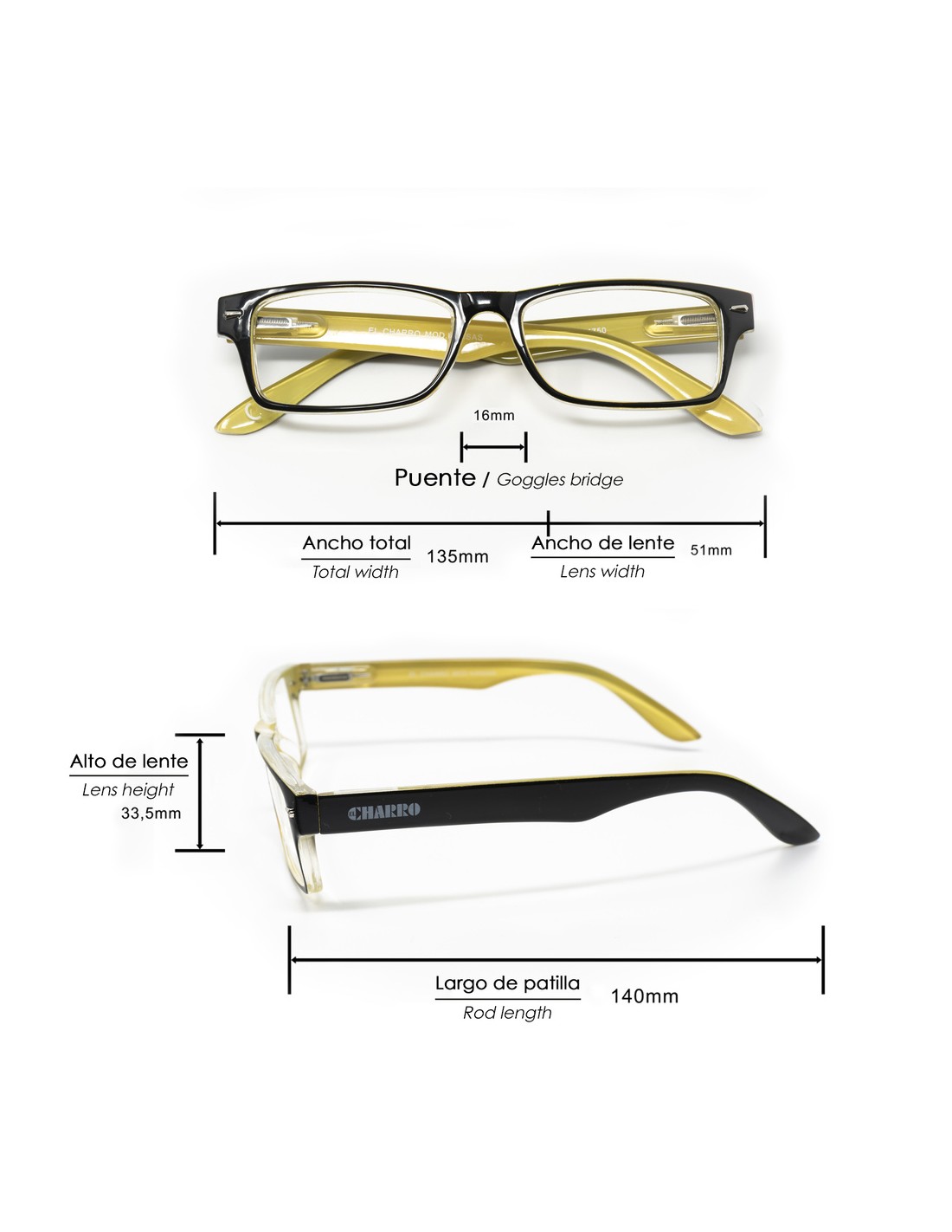 - Gafas de aumento para lectura con montura bicolor negro y amarillo.