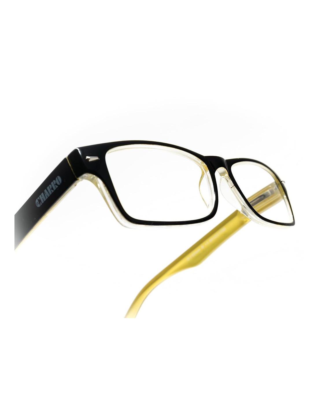 - Gafas de aumento para lectura con montura bicolor negro y amarillo.