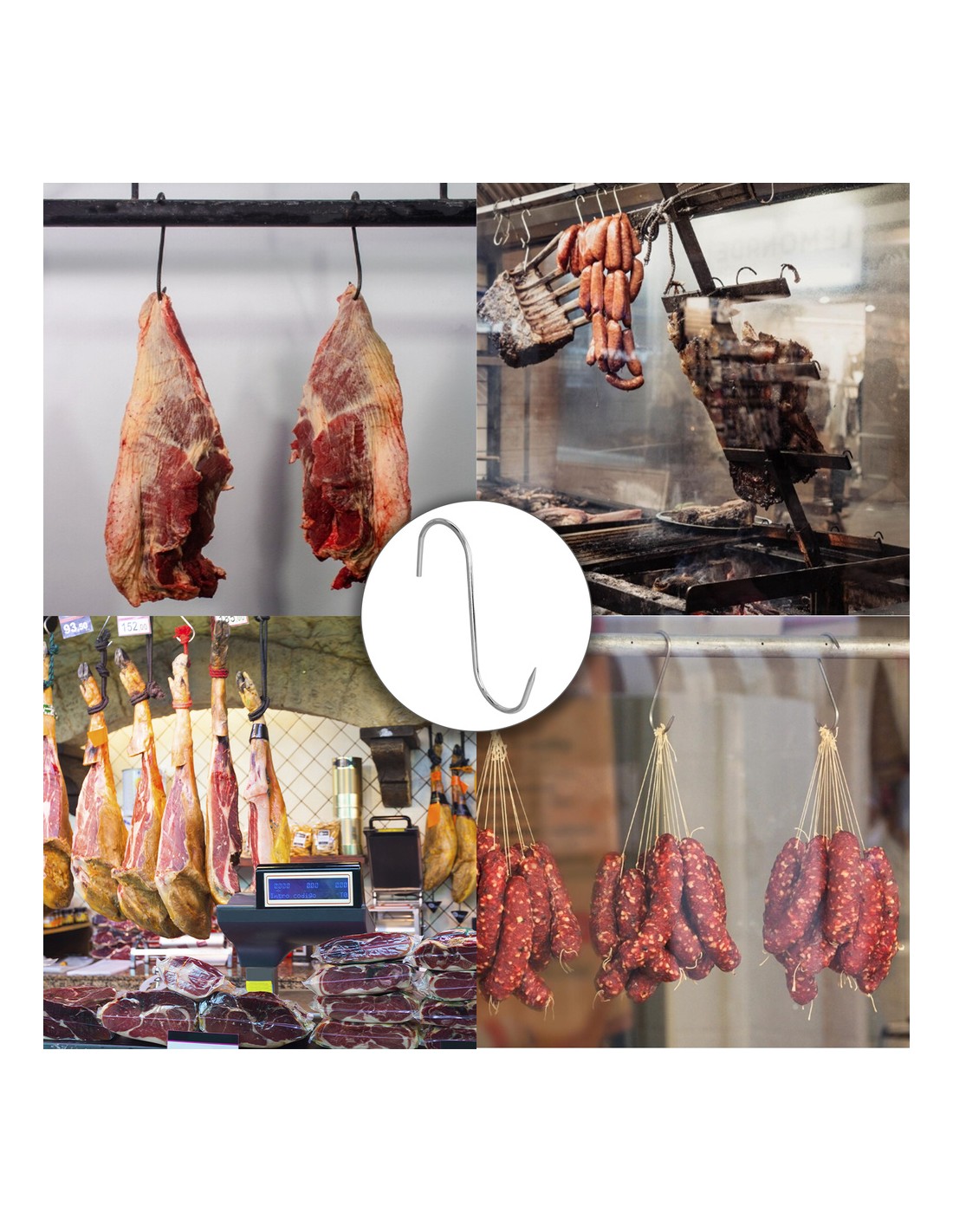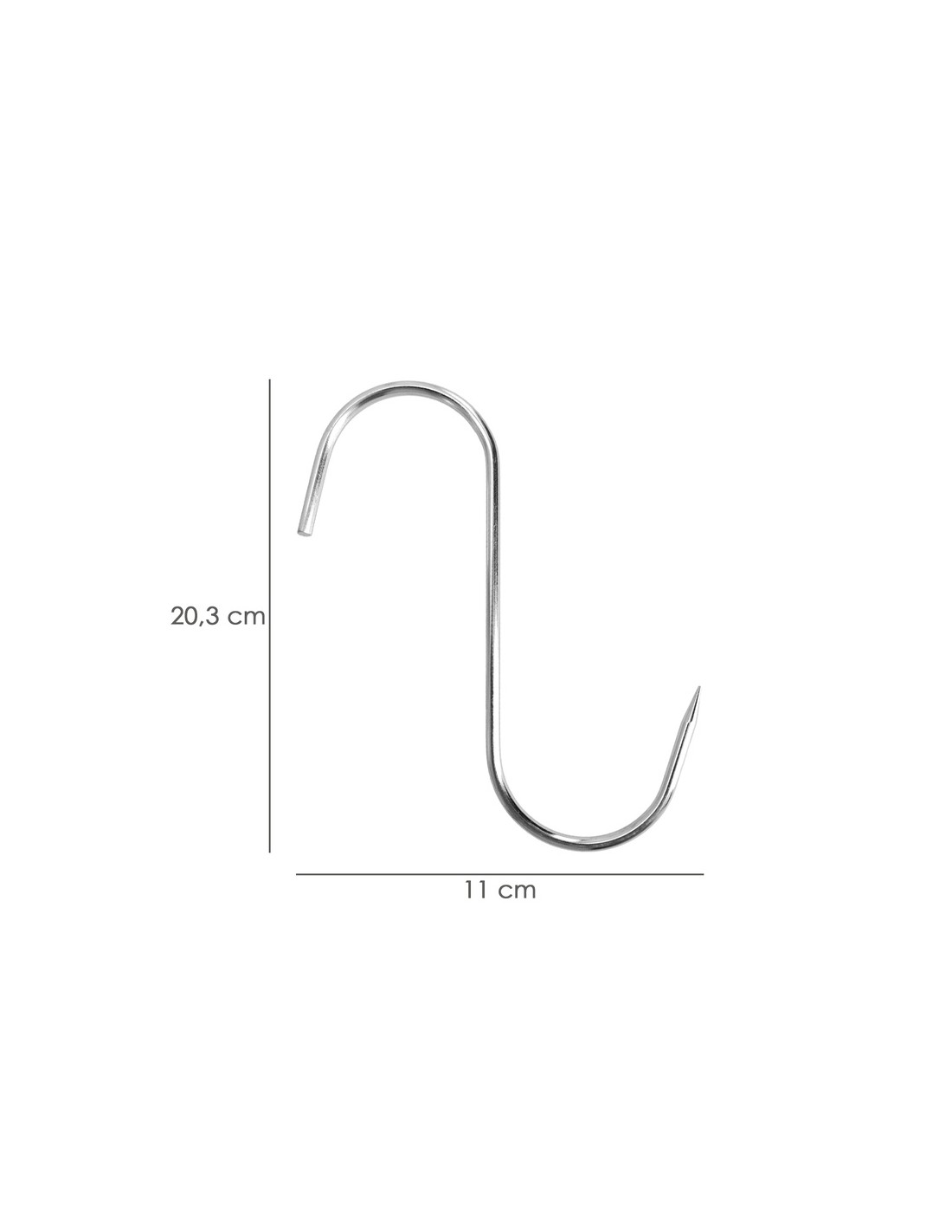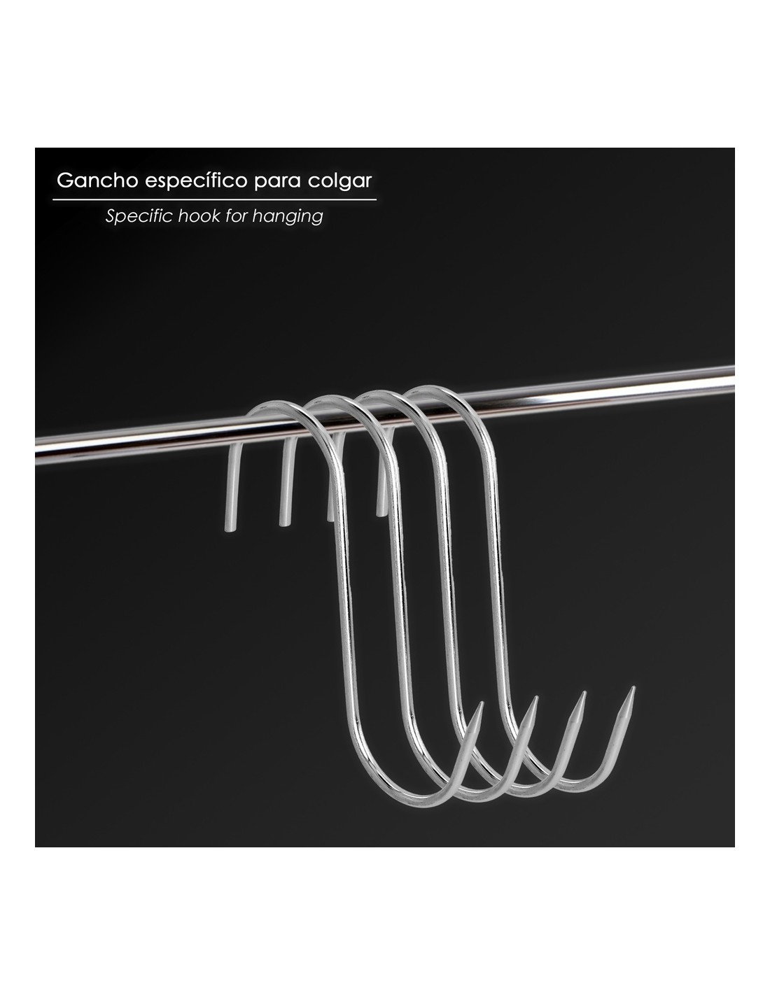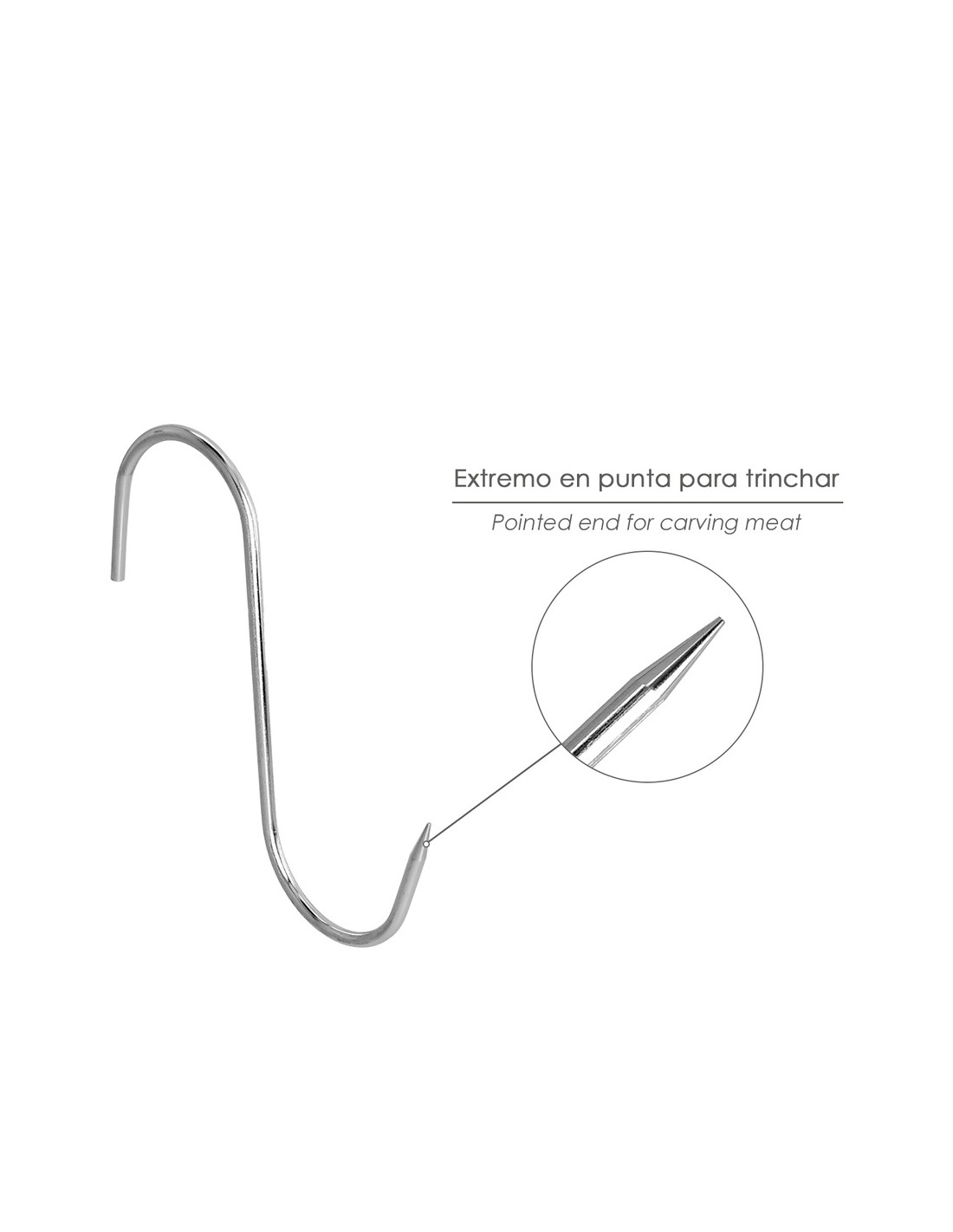 - Forma "S" con punta puntiaguda para facilitar el clavado en productos carnicos.