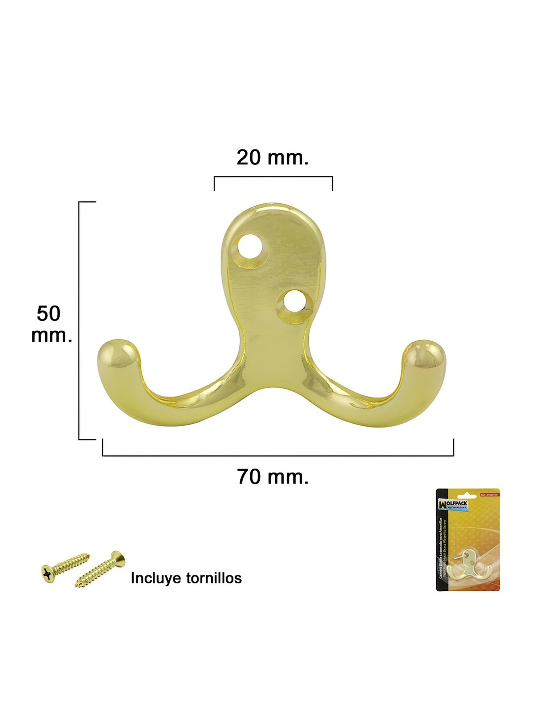 Gancho colgador doble para atornillar - Color: latonado. - Medida: 70x50 mm. - Realizado en metal. - Con tornillos incluidos - Articulo conocido como gancho, perchas,gancho colgar, colgador, alzapaños.