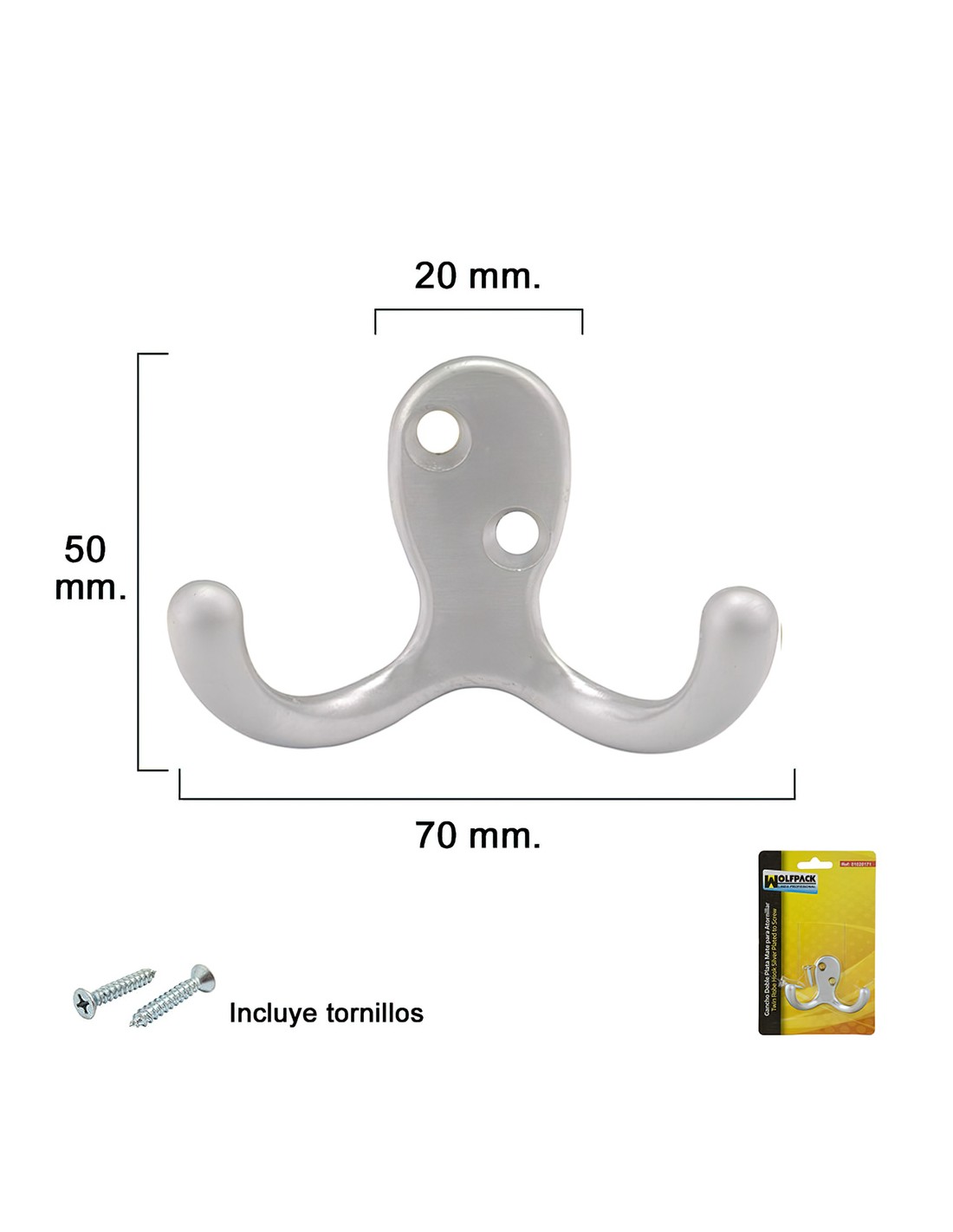 Gancho colgador doble para atornillar - Color: Plateado mate. - Medida: 70x50 mm. - Realizado en metal. - Con tornillos incluidos - Articulo conocido como gancho, perchas,gancho colgar, colgador, alzapaños.