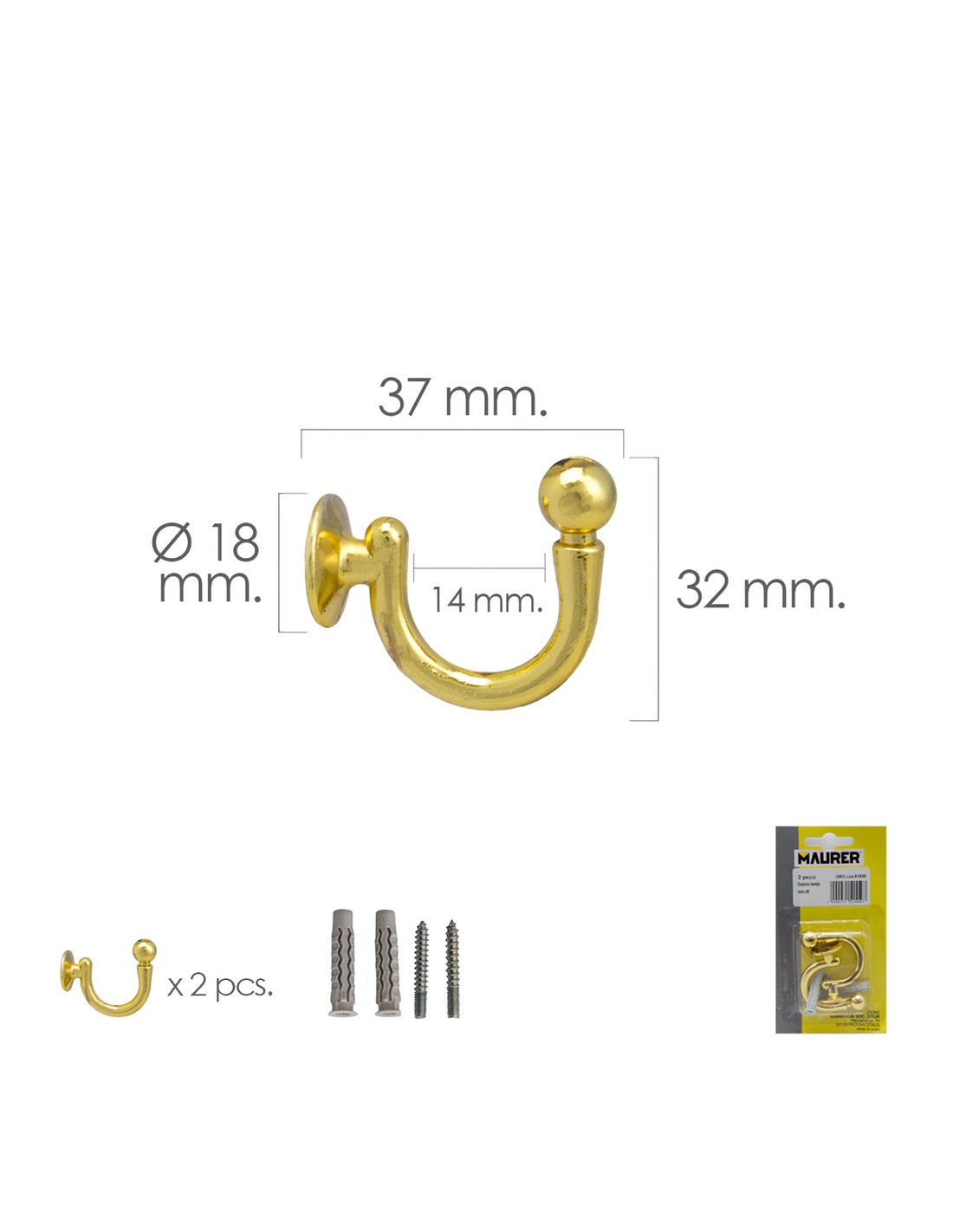 Gancho Latonado Atornillabe 37 mm. Con tacos y tornillos (Blister 2 piezas)