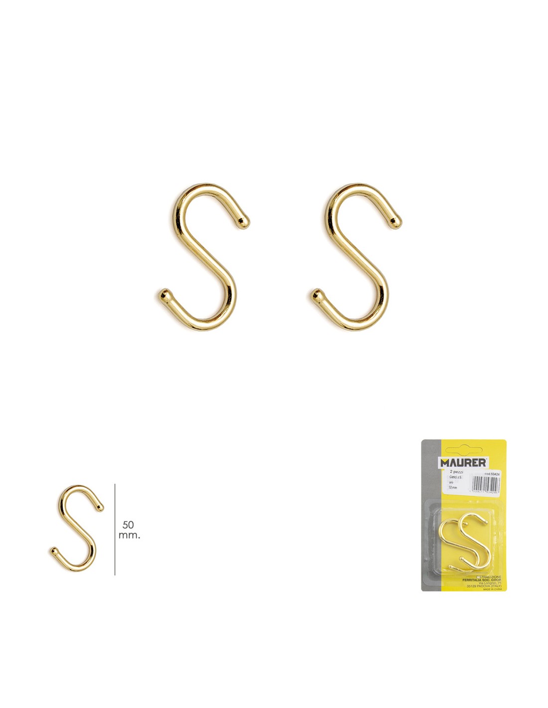 Gancho forma S - Medida: 50 mm. - Acabado dorado. - No procede su uso en tareas profesionales, industriales o sujección de carga alguna - Blister 2 piezas - Articulo conocido como colgador S, colgador forma S.