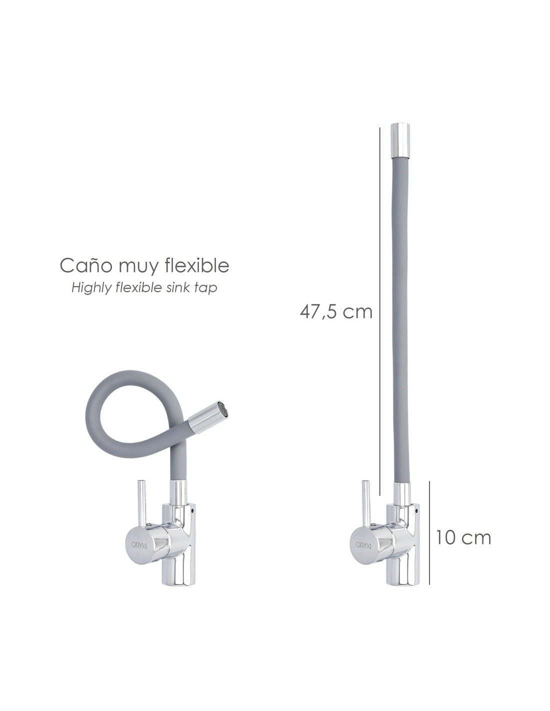 - Caño flexible, puedes colocar el caño en la posición deseada, flexible en cualquier dirección.