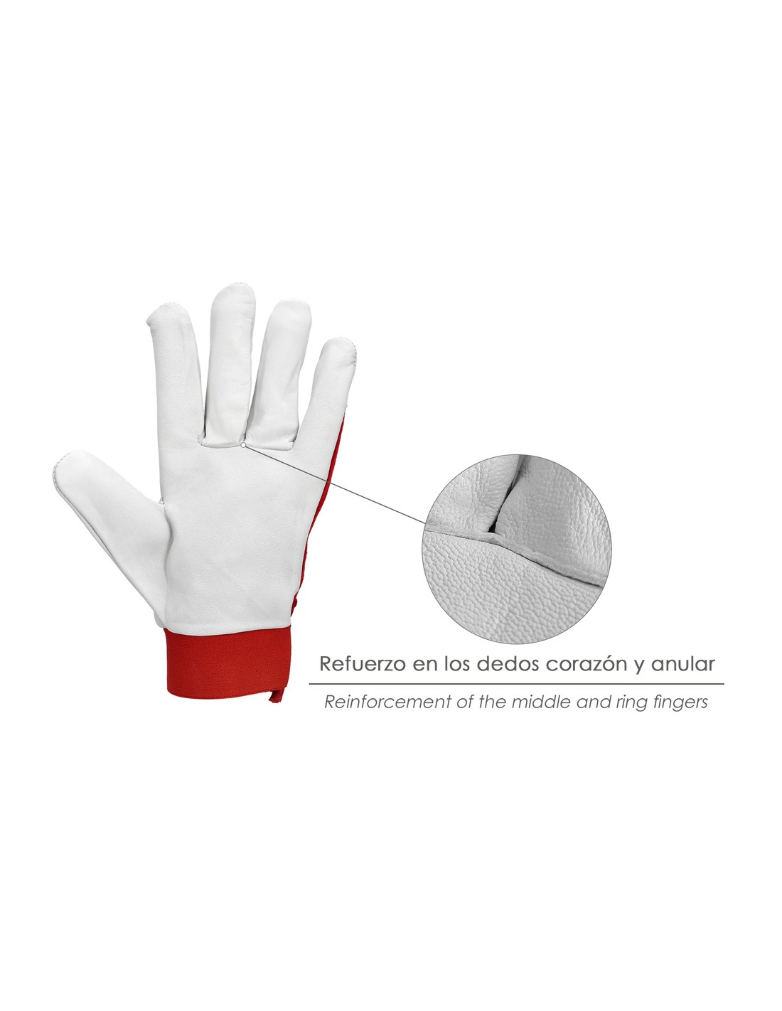 - Costura de refuerzo en el dedo corazón y anular.