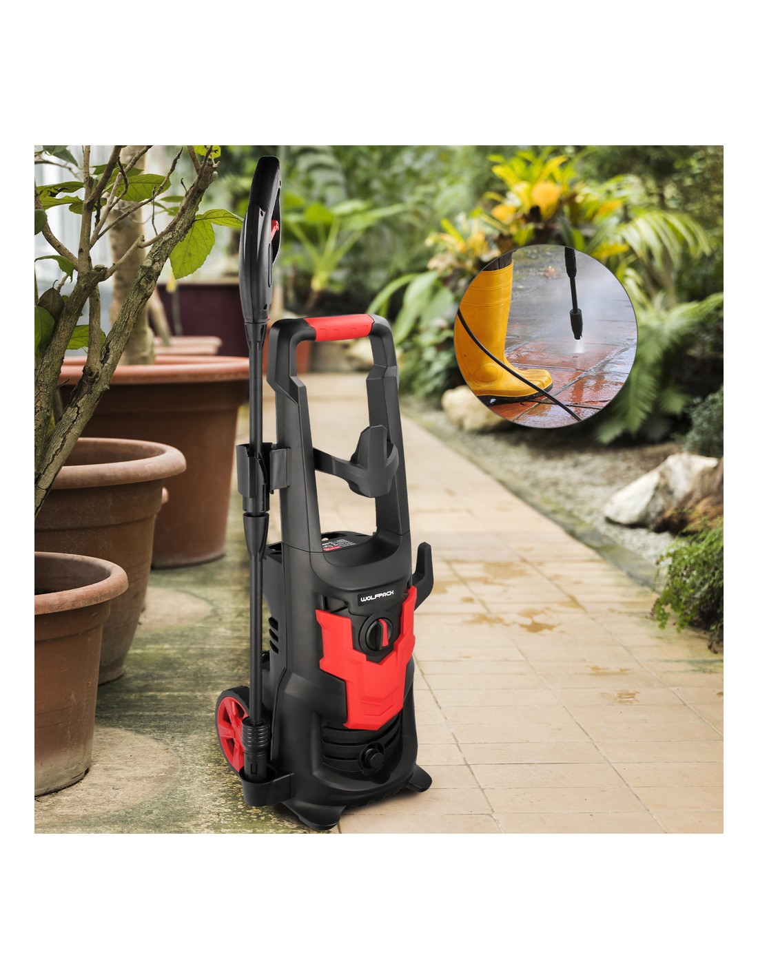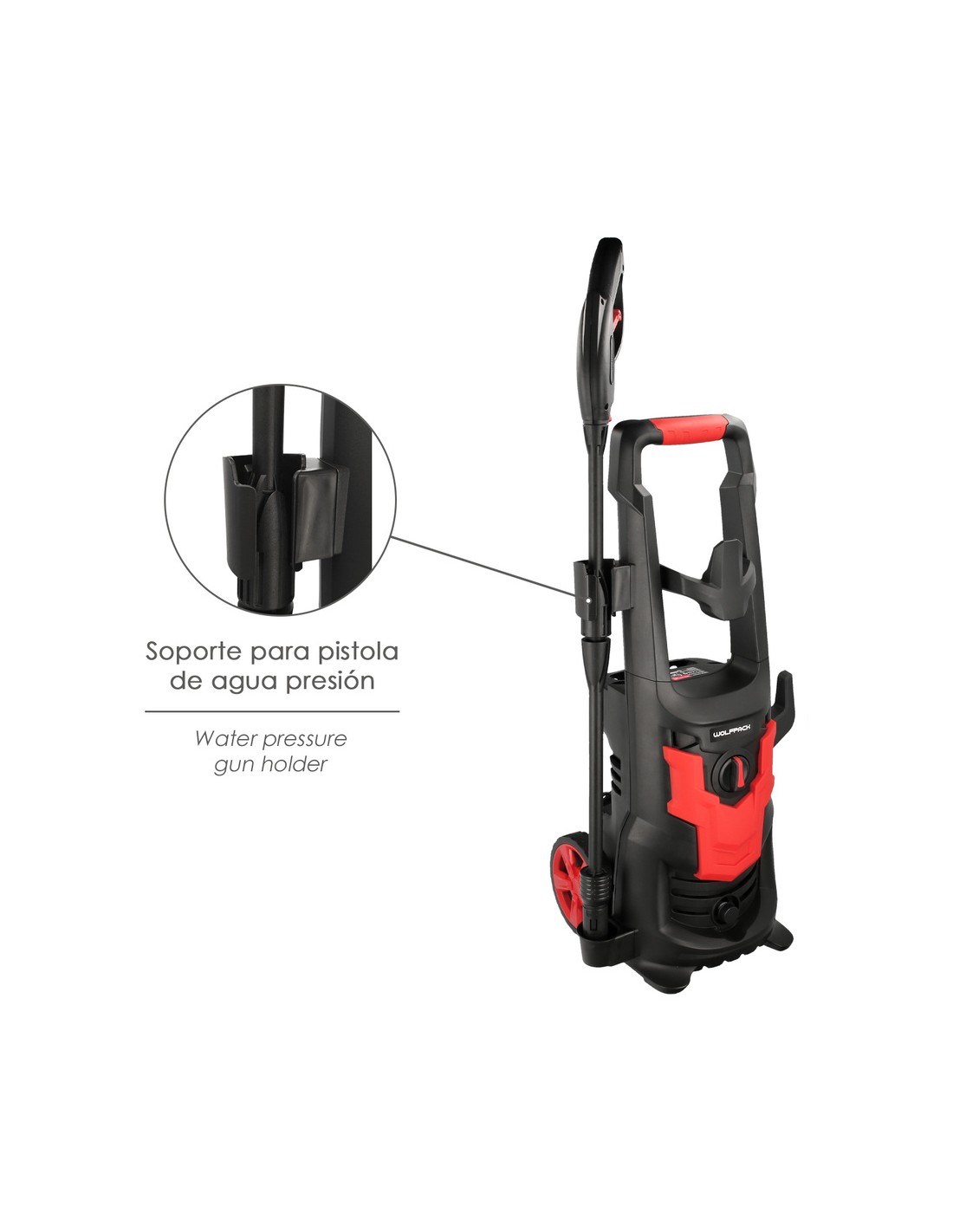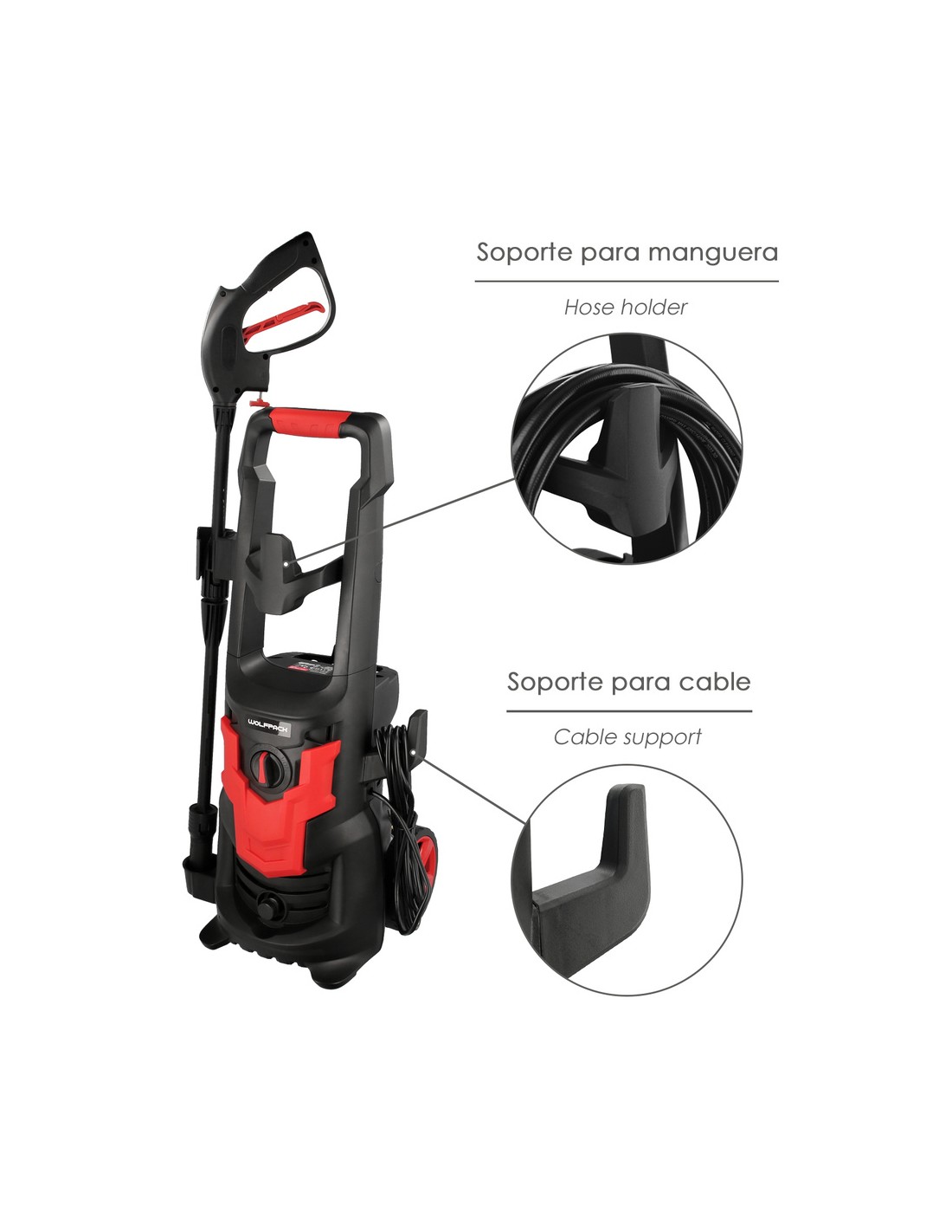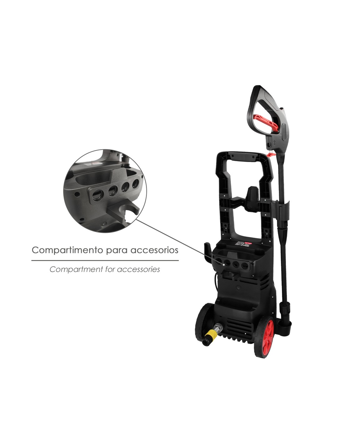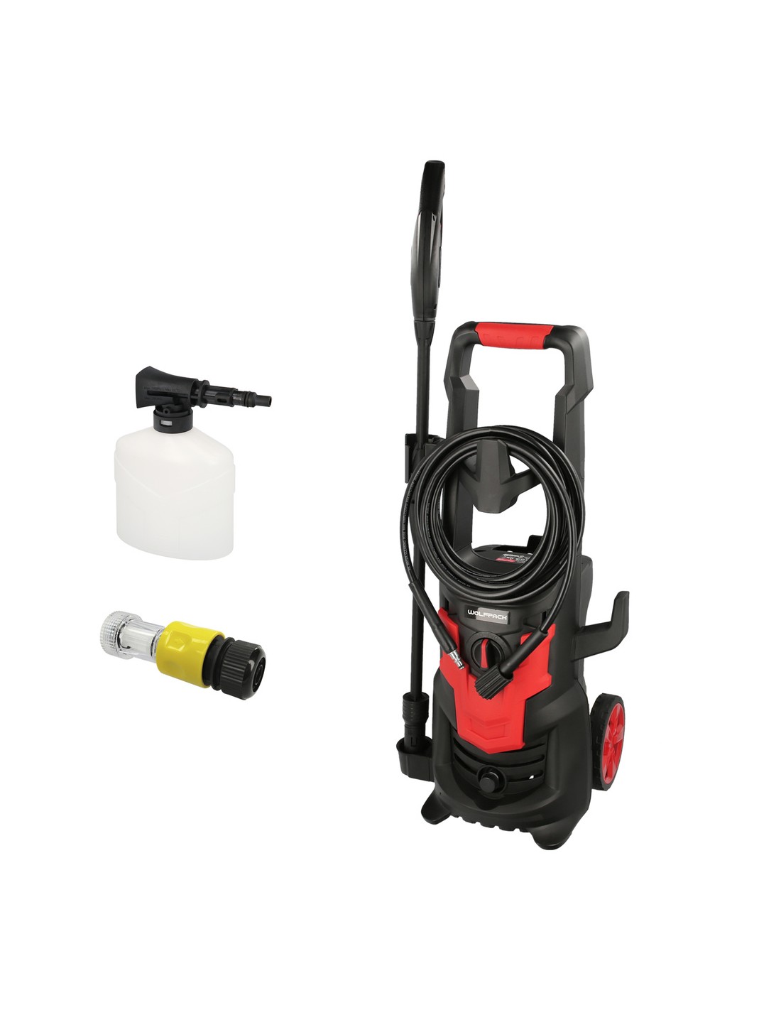 - Incluye, pistola, lanza, manguera de 5 metros de longitud, deposito para jabón (500 ml.) y un adaptador.