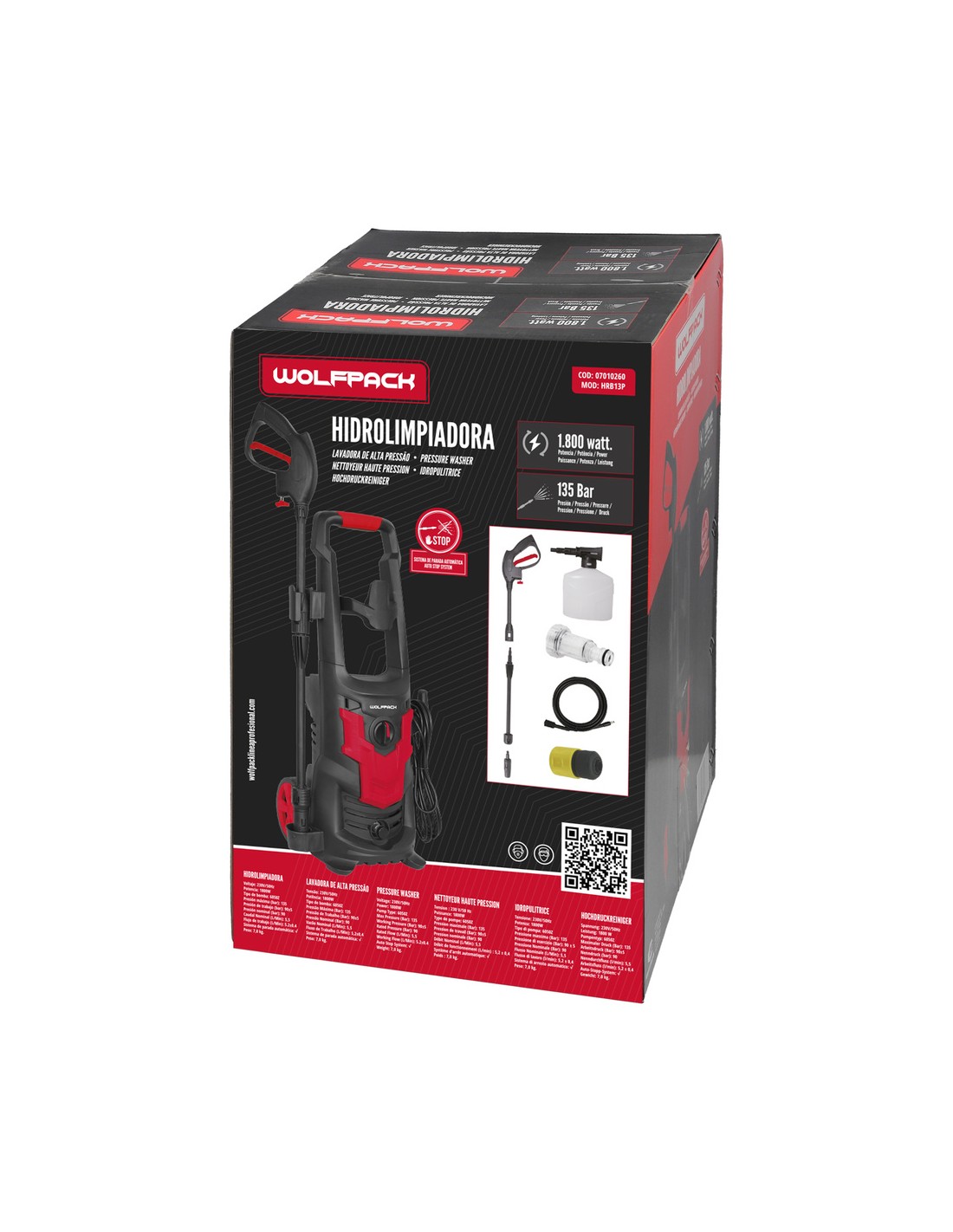 Hidrolimpiadora Alta Presión 135 Bares 1.800 Watt. Con Accesorios. 330 Litros / Hora. Limpiadora de Agua Con Deposito Detergente