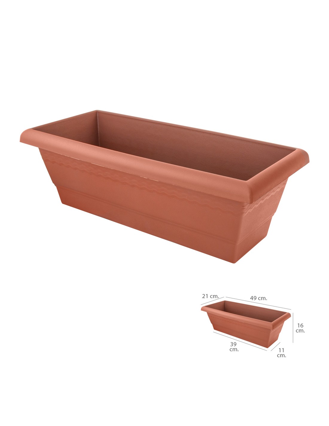 Jardinera balcon Saturnia - Realizado en plástico. - Color terracotta. - Con orificios en la base. - Medidas: 49x21x16 (Alt) cm. - Artículo también conocido como macetero balcón, tiesto balcón.