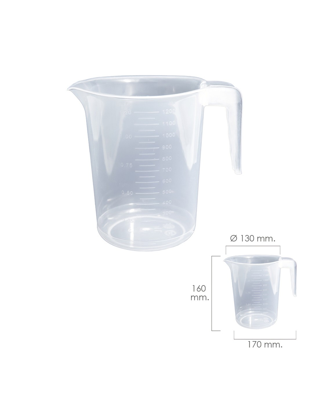 Jarra recipiente alimentos microondas - Capacidad: 1.2 litros. Jarra medidora - Medida: Ø 13 x 16 (alt.) cm. - Capacidad: 1 litro. - Se puede usar en el microondas y el lavavajillas. - Realizado en plastico. - Con escalas de capacidad.