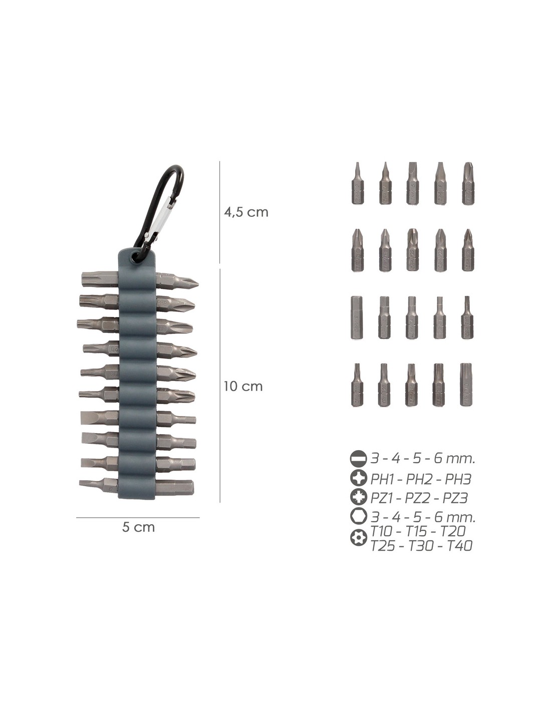 - Incluye mosqueton para ser colgadas en un cinturon o bien tenerlas de forma organizada en su caja de herramientas.