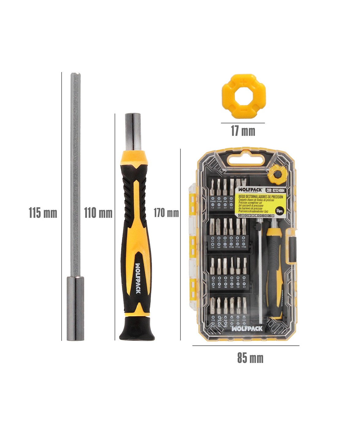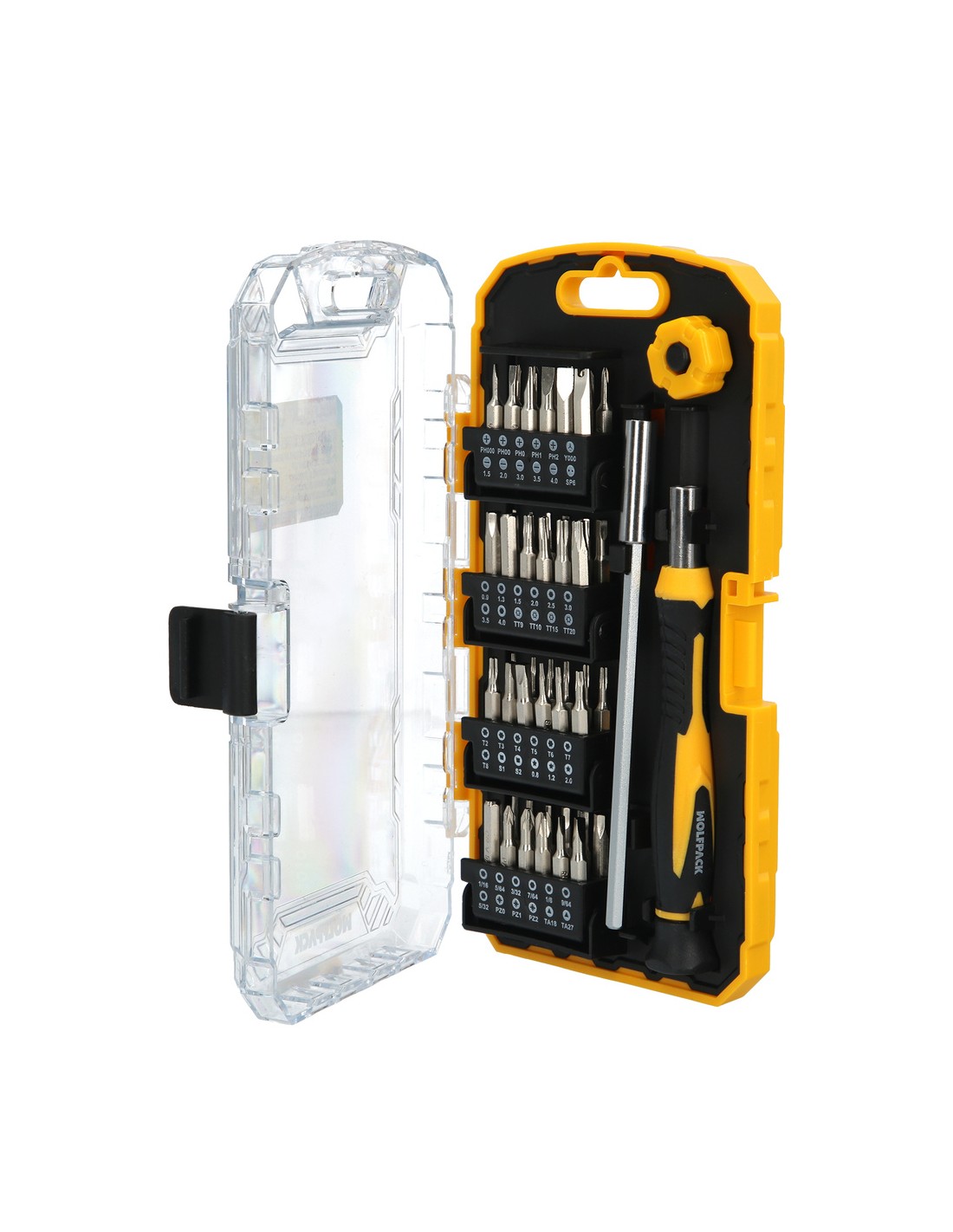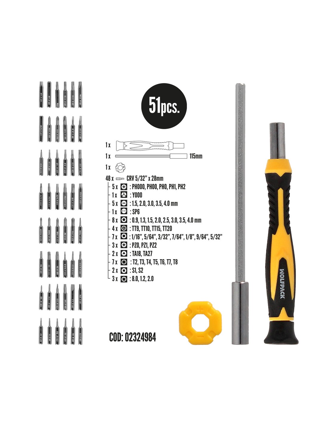 - Contiene 48 puntas de 28 mm que incluyen un alargador metálico, un imantador, cinco puntas Phillips (PH000, PH00, PH0, PH1, PH2), una punta Tri-Wing Y000, cinco puntas planas (1.5, 2.0, 3.0, 3.5, 4.0), una punta Spanner SP6, ocho puntas hexagonales (0.9, 1.3, 1.5, 2.0, 2.5, 3.0, 3.5, 4.0), cuatro puntas Torx-Seguridad (TT9, TT10, TT15, TT20), siete puntas Torx (T2, T3, T4, T5, T6, T7, T8), dos puntas cuadradas (S1, S2), tres puntas estrella (0.8, 1.2, 2.0), siete puntas Allen (1/16, 5/64, 3/32, 7/64, 1/8, 9/64, 5/32), tres puntas Pozi Drive (PZ0, PZ1, PZ2), y dos puntas triangulares (TA18, TA27).