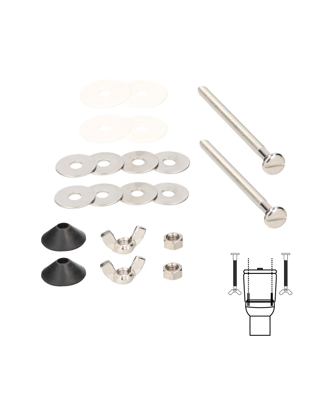 Kit sanitario cisterna/inodo 6x90 (T-291) - Medida: 6x90 mm. - Juego de tornillos para unir la cisterna e inodoro. - Con varios componentes: tornillos, arandelas, gomas, ect.