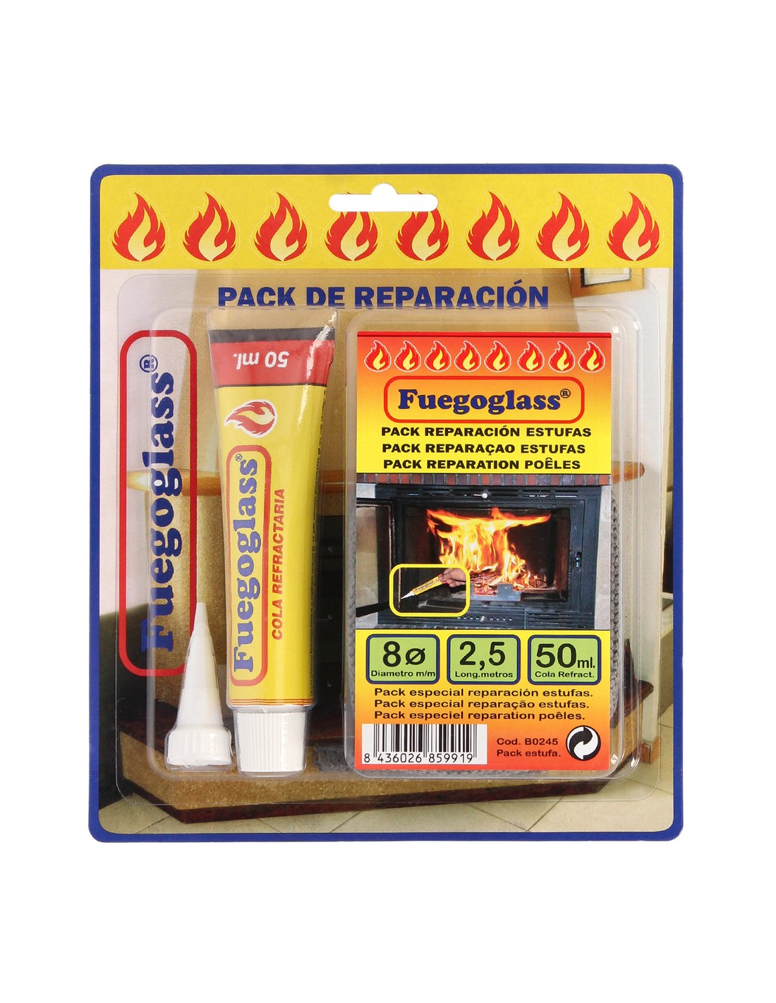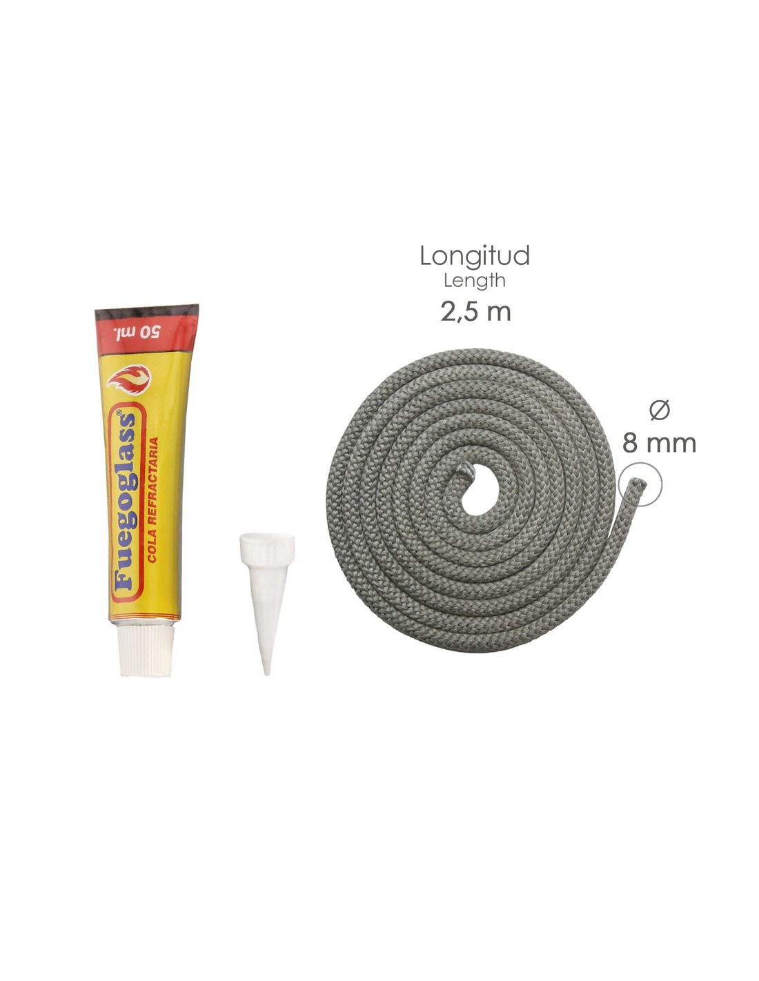 - Kit comupesto por pegamento cola refráctario y cordon de fibra de vidrio trenzado de Ø 8 mm. y 2.5 m. para el sellado en estufas, chimeneas, fogones, hornos, etc.