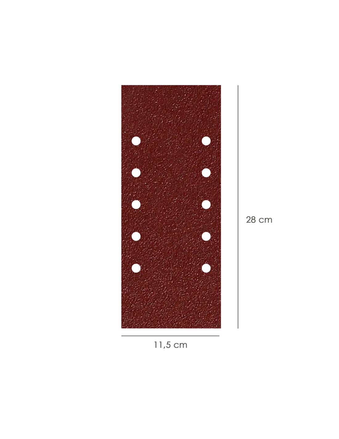 Lija recambio para lijadoras - Medidas: 115 x 280 mm. - Recambios con agujeros. - Grano 40. - Con velcro. - Uso universal en lijadoras orbitales. - 10 piezas. - Tamaño standard.