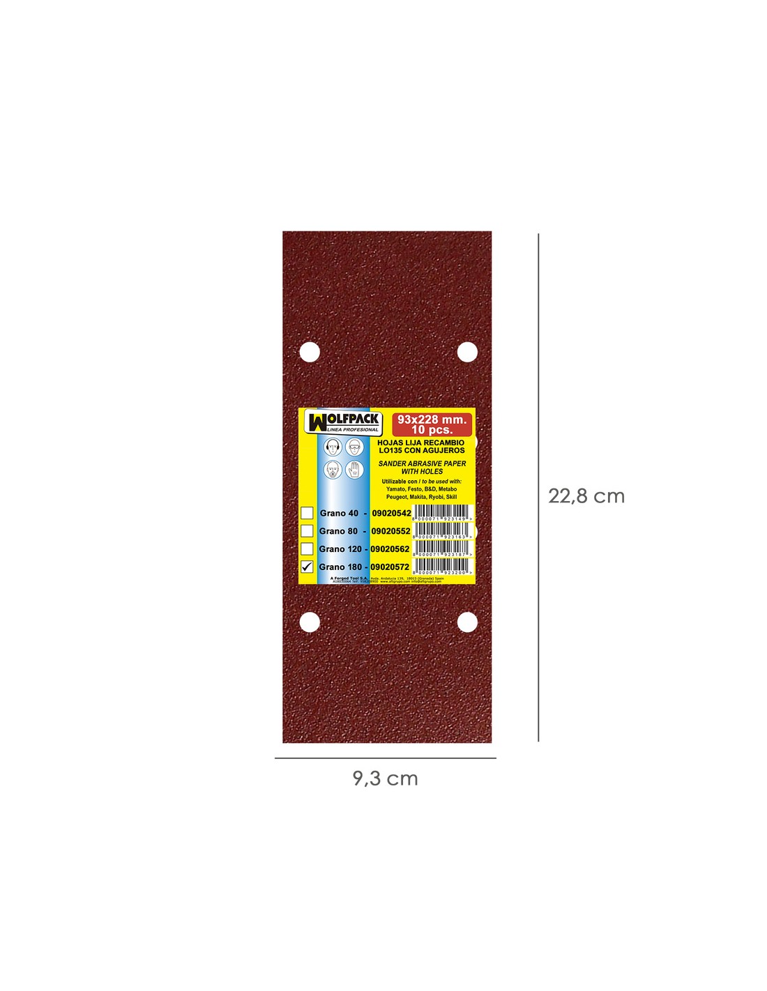 Lija recambio para lijadoras - 10 piezas. - Medidas: 93 x 228 mm. - Recambios con agujeros. - Grano 180. - Uso universal en lijadoras orbitales. - Tamaño standard.