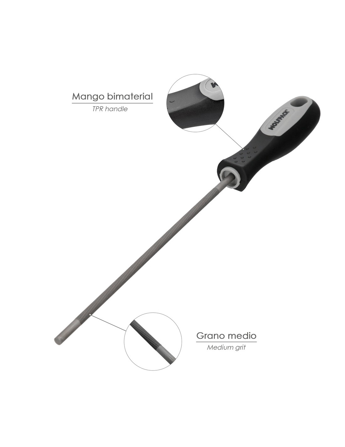 Lima Wolfpack con mango motosierras 8" 5/32" - Longitud: 320 mm. - Diámetro: 4,0 mm. - longitud lima: 200 mm. - Lima para motosierra 5/32" - Mango ergonómico.