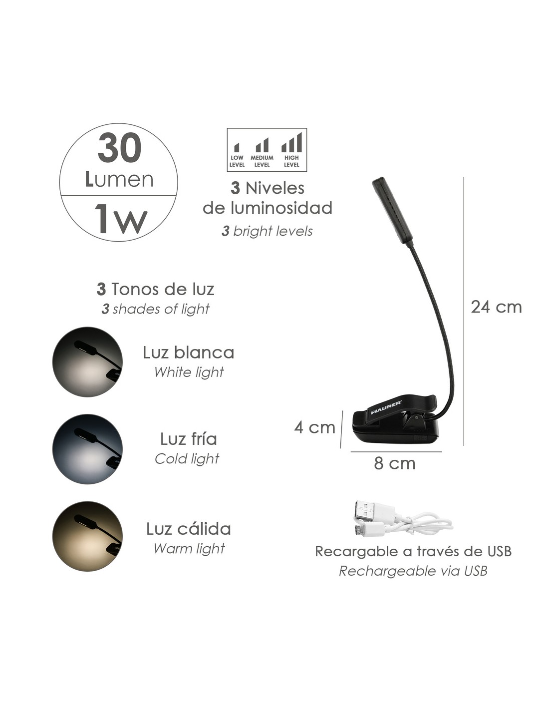 Linterna LED De Mesa / Lectura Bateria Recargable (1.000 mAh) 30 Lumenes Con Clip, 3 Tonos De Luz y 3 Niveles De Luminosidad