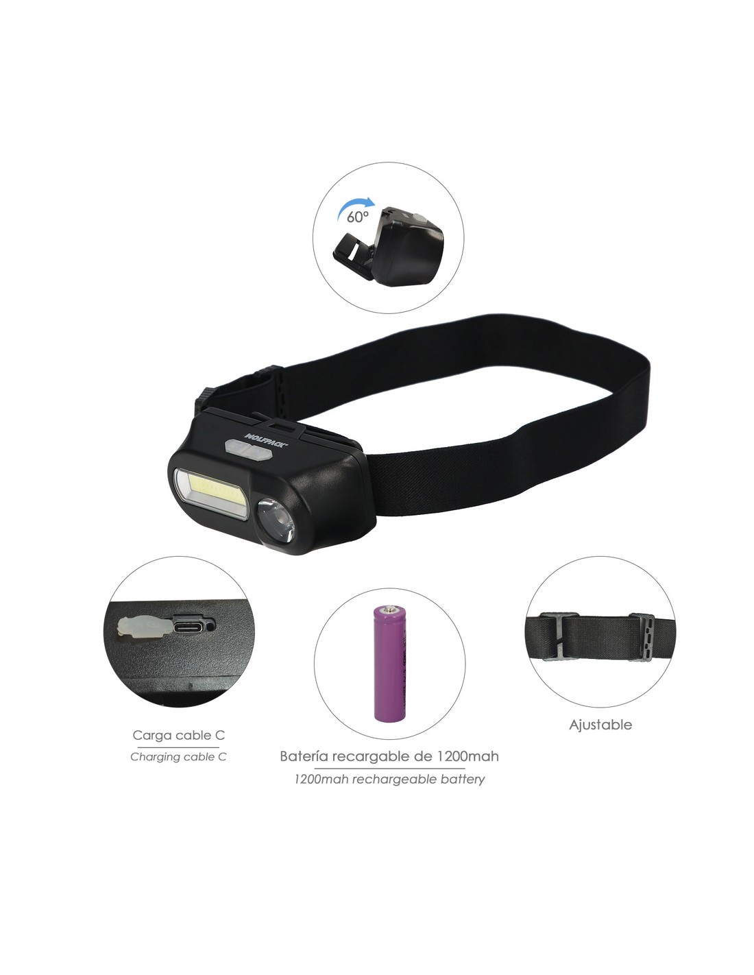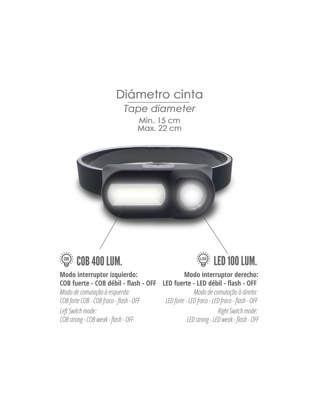 - Dispone de dos LEDs independientes de 400 LUM (COB) y 100 LUM (LED). Con 3 modos diferentes de iluminación / potencia. (Fuerte, debil y flash)
